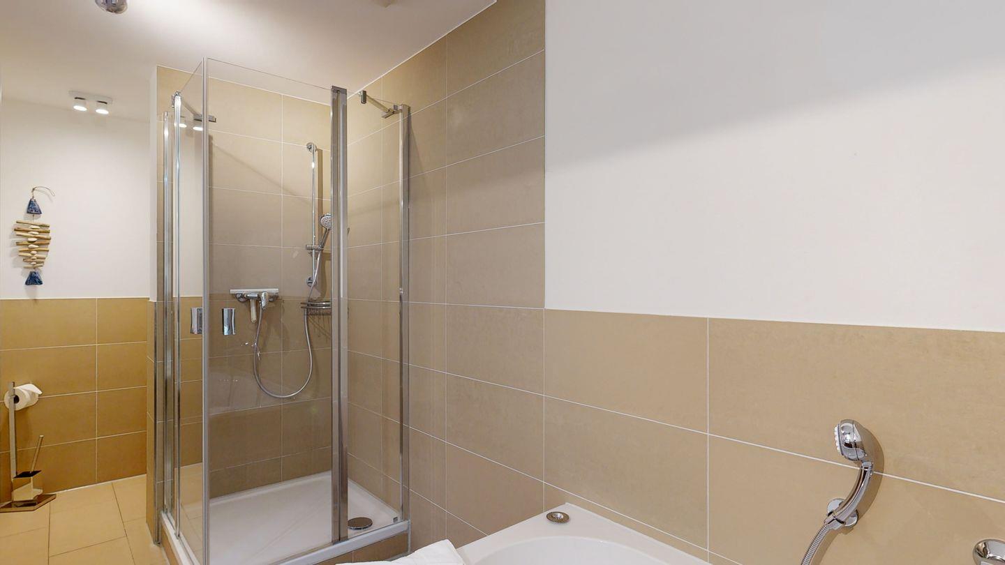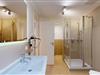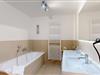 * Großes Badezimmer mit Dusche, Badewanne und Doppelwaschbecken, WC, Föhn, Waschmaschine