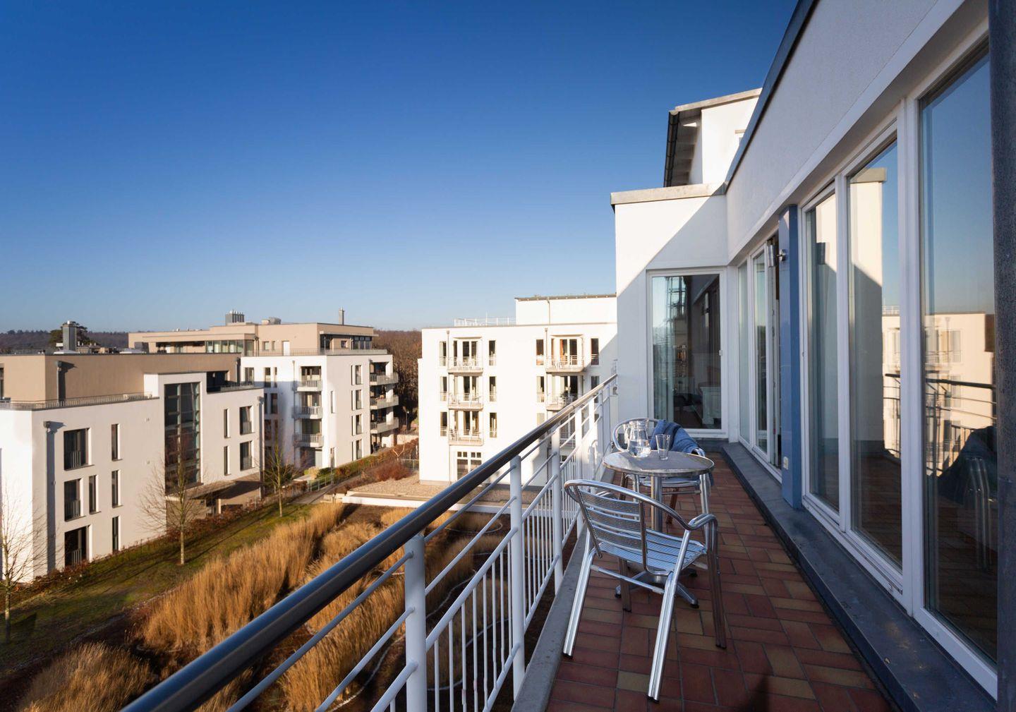 * 12 m² großer Südbalkon mit Balkonmöbeln (Südwest-Ausrichtung)