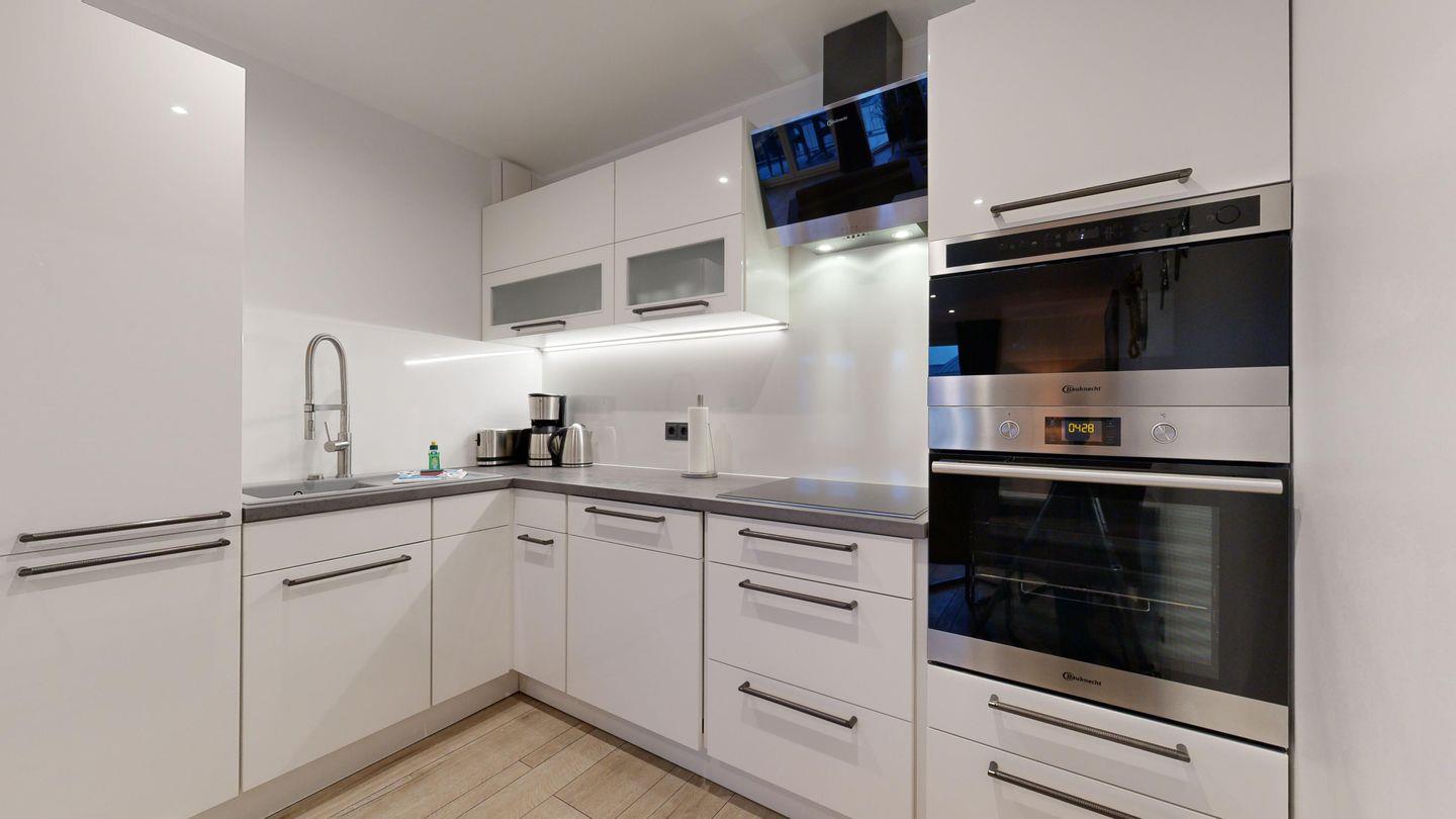 * Neue hochwertige Küche mit Induktionsfeld, Herdhochschrank mit Einbaumikrowelle (Dampfgarfunktion) Kühlschrank mit Kühlgefrierkombination, Backofen, Spülmaschine, Toaster, Wasserkocher, Kaffeemaschine