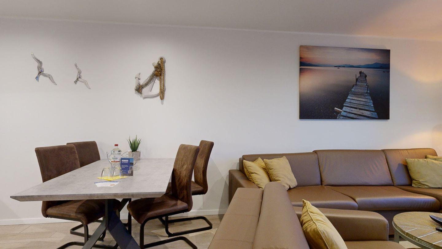 * Wohnzimmer mit großer Eck-Couchgarnitur (Schlafcouch für 2 Personen), Sessel, Flachbild-TV (65 Zoll), Radio, Internetzugang (WLAN inkl.), Esstisch