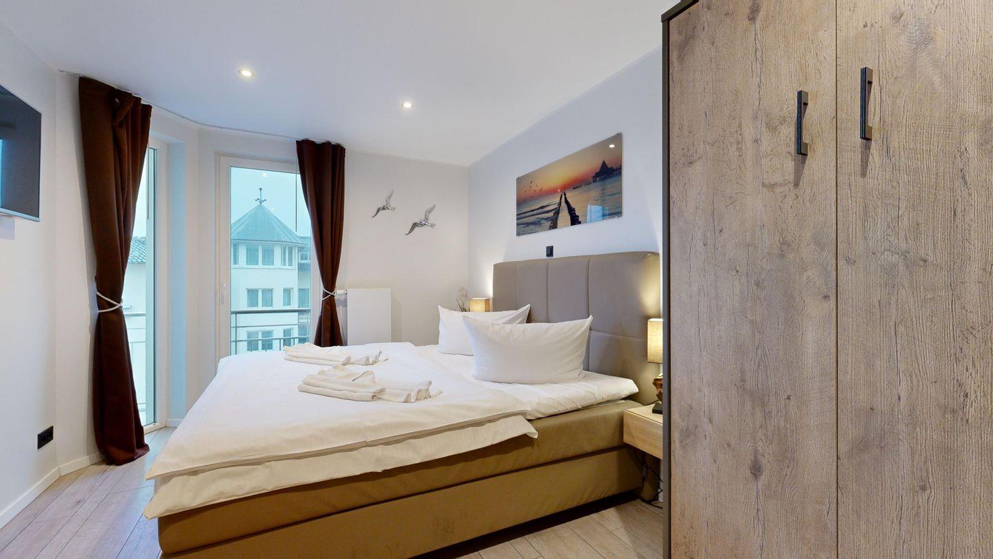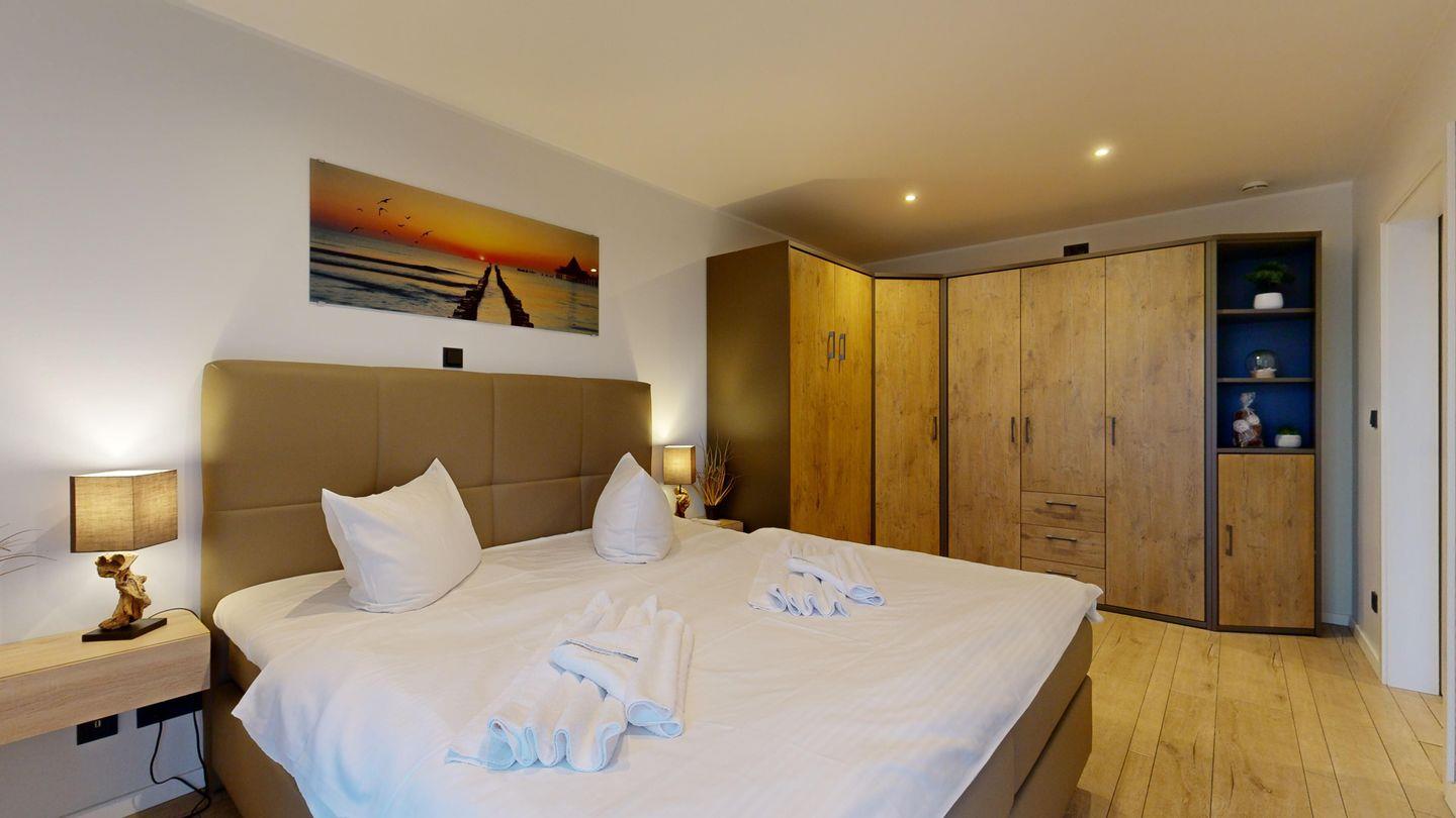 * 1 Schlafzimmer mit einem Doppelbett (Boxspringbett), Kleiderschrank und TV (40 Zoll), Bügelbrett+Bügeleisen. Zusätzlich ist im Schlafzimmer ein Schrankbett für eine Person.