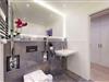 * Behindertenfreundliches Badezimmer (Schiebetürbreite 0,90 m) mit Dusche/Tiefeinsteiger, WC und Föhn. Die Dusche ist mit Rollstuhl befahrbar, klappbarer Sitzhocker. Der Waschtisch ist unterfahrbar. Haltegriffe am WC