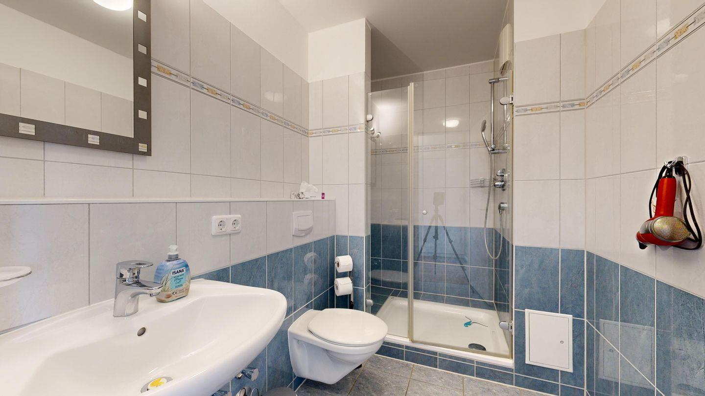 * Badezimmer mit großer Dusche, WC und Föhn