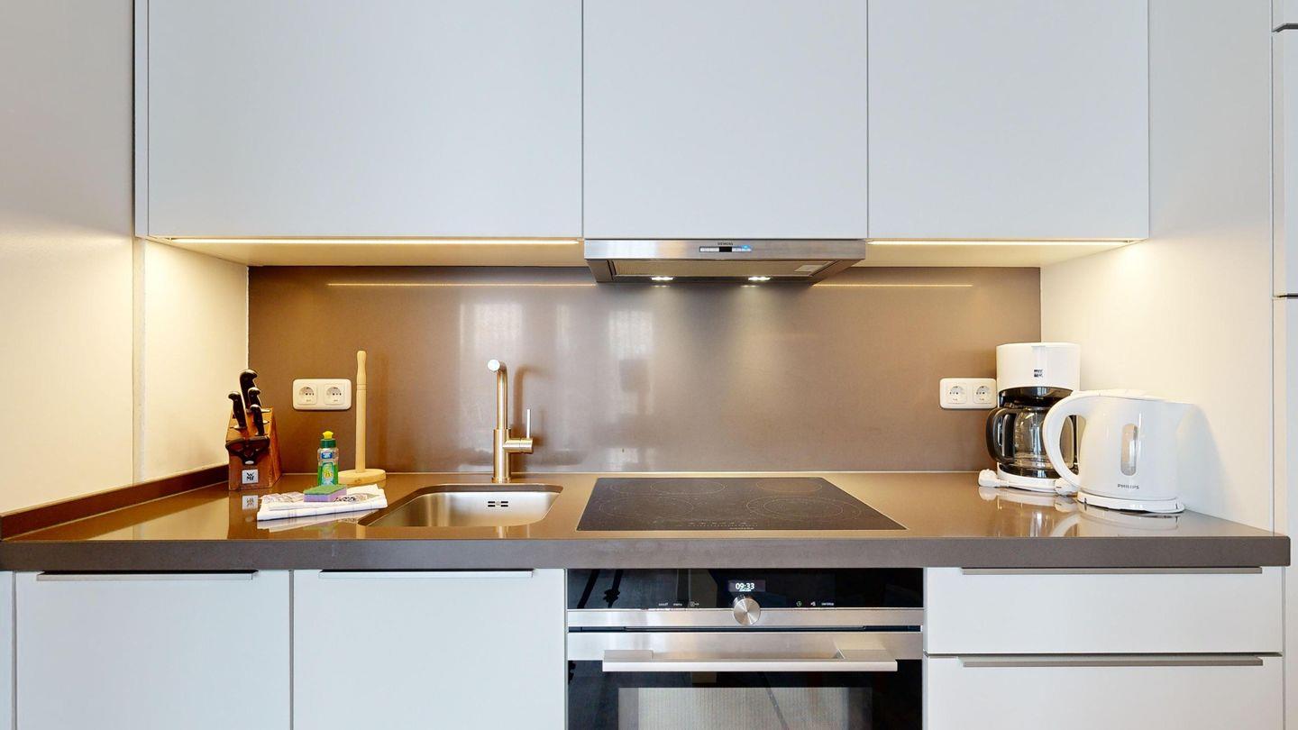 * Küche mit Ceranfeld, Kühlschrank mit Gefrierfach, Backofen mit integrierter Mikrowelle, Spülmaschine, Toaster, Wasserkocher, Kaffeemaschine
