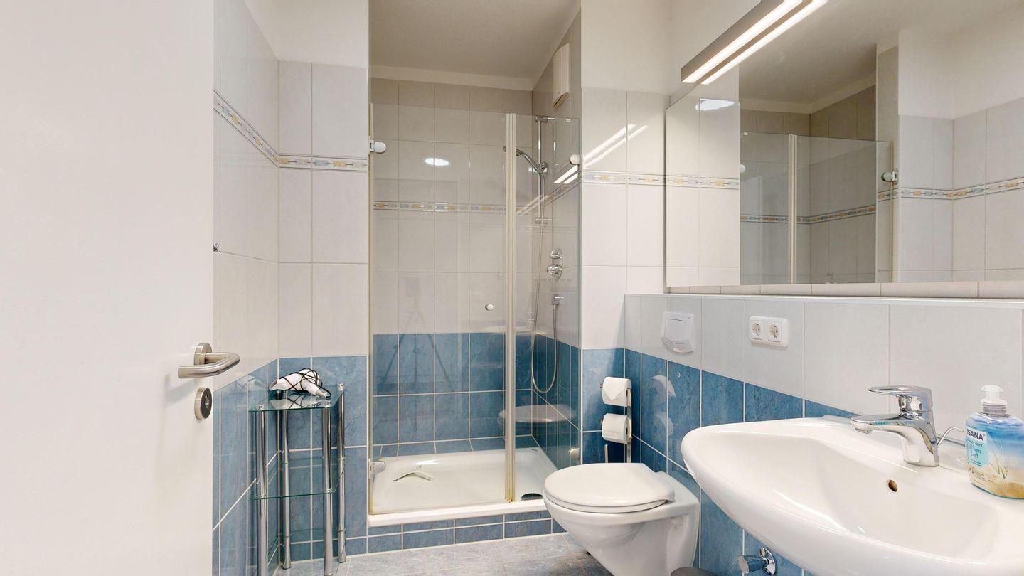 * Badezimmer mit großer Dusche, WC und Föhn