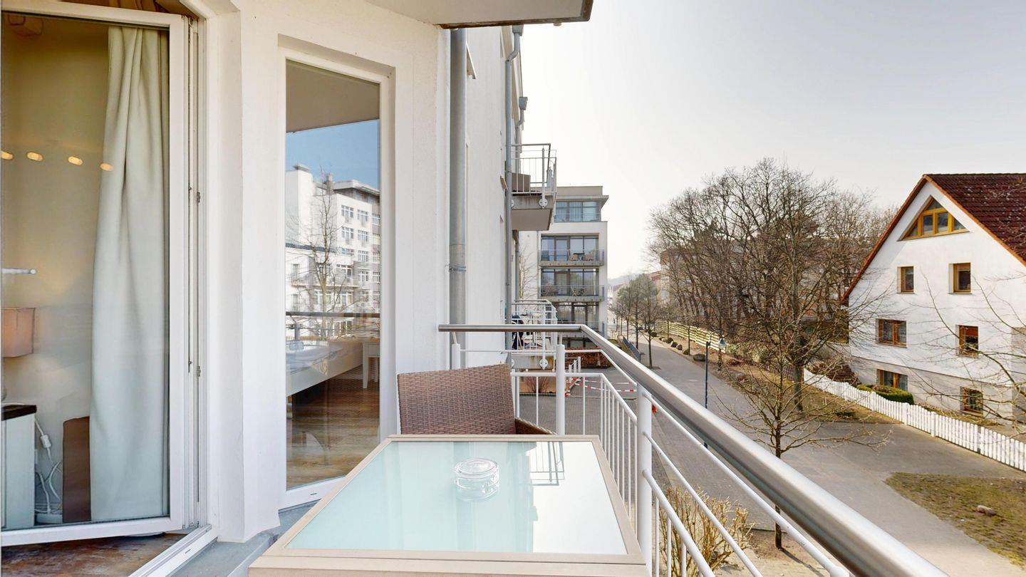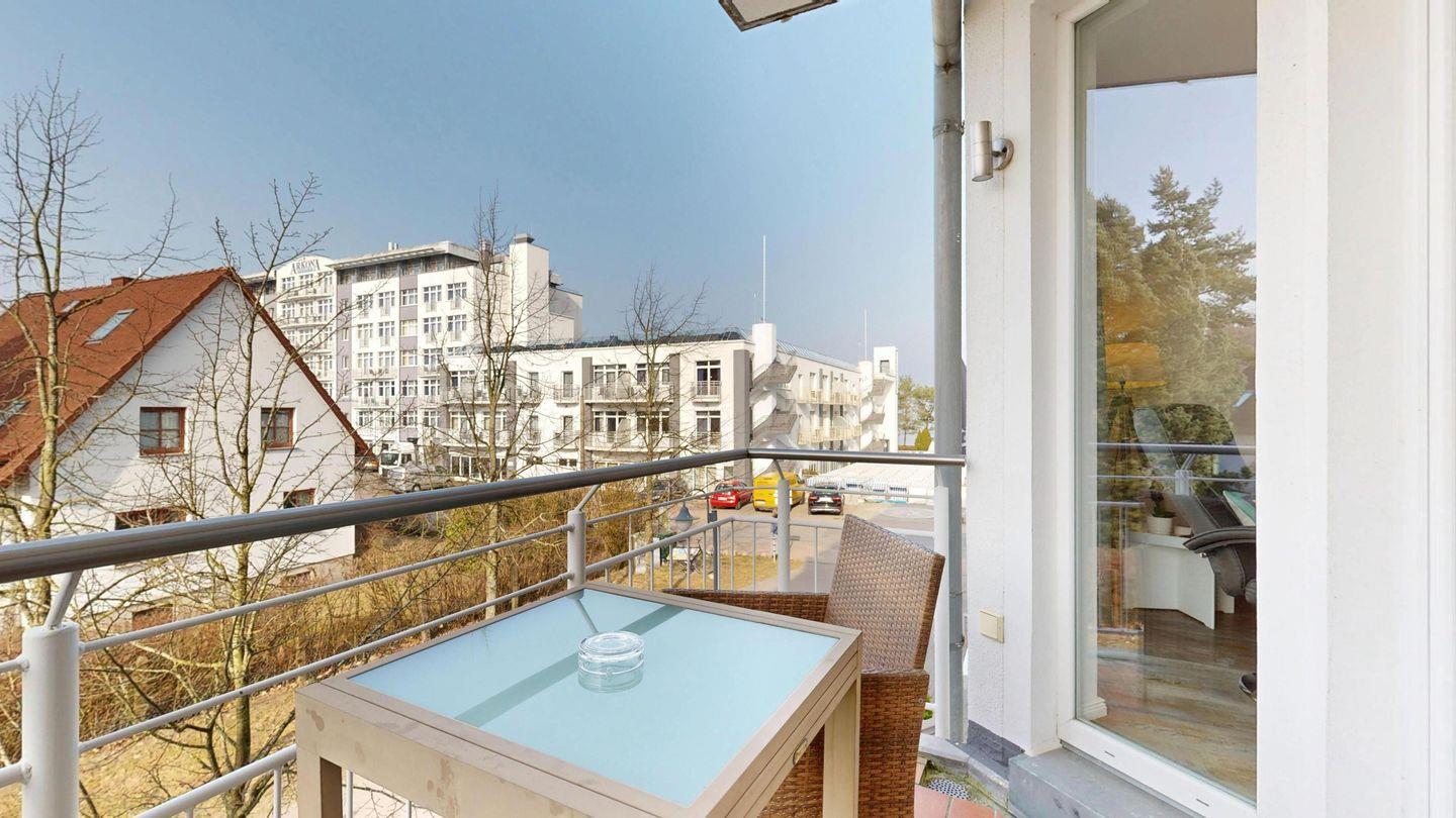 * Balkon mit Balkonmöbeln (Nordwest-Ausrichtung); vom Balkon haben Sie einen seitlichen Ostseeblick.