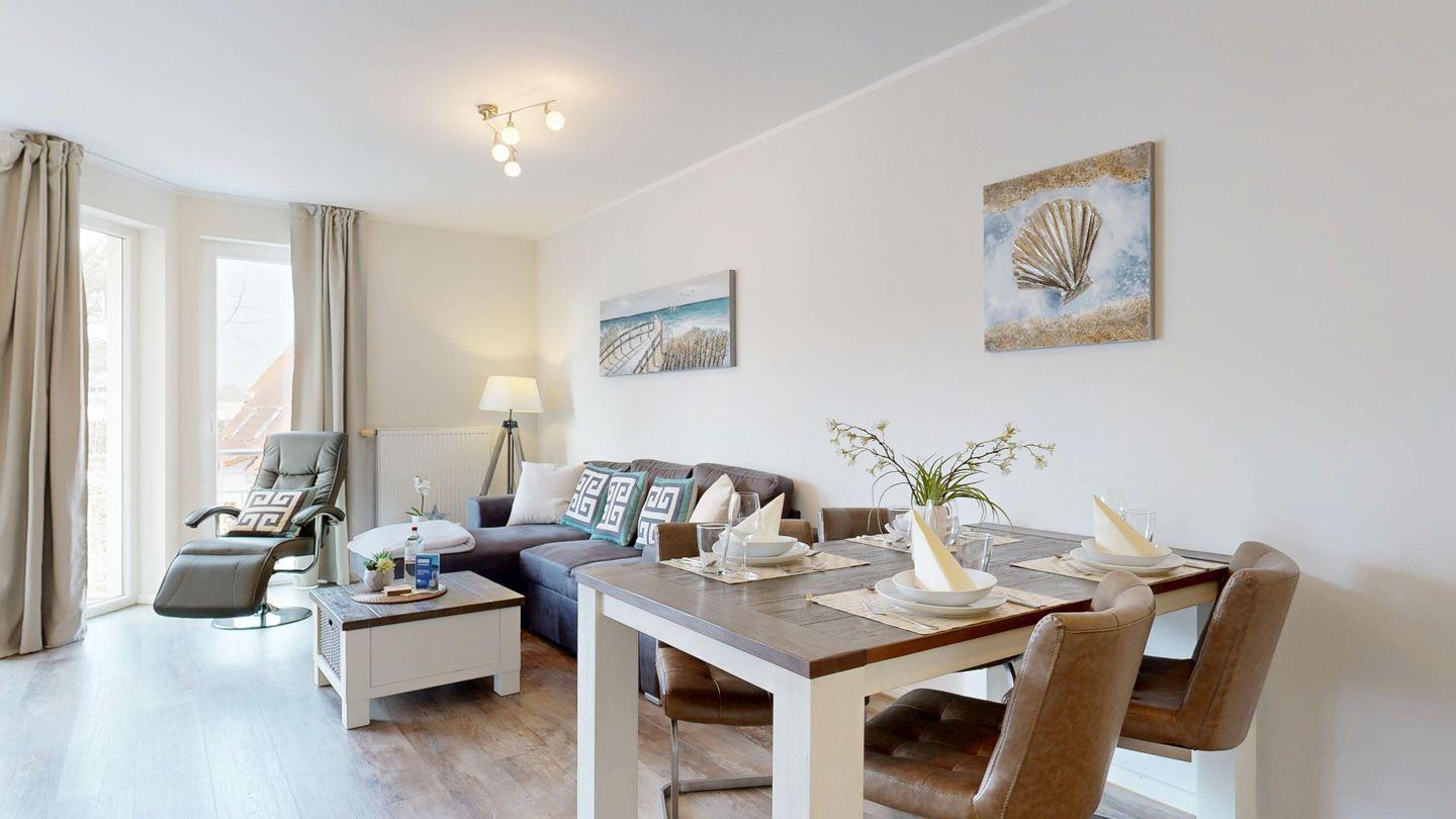 * Wohnzimmer mit Couchgarnitur (Schlafcouch für 2 Personen), Sessel, Flachbild-TV, Elektro-Kamin, Radio, Internetzugang (WLAN inkl.), Esstisch