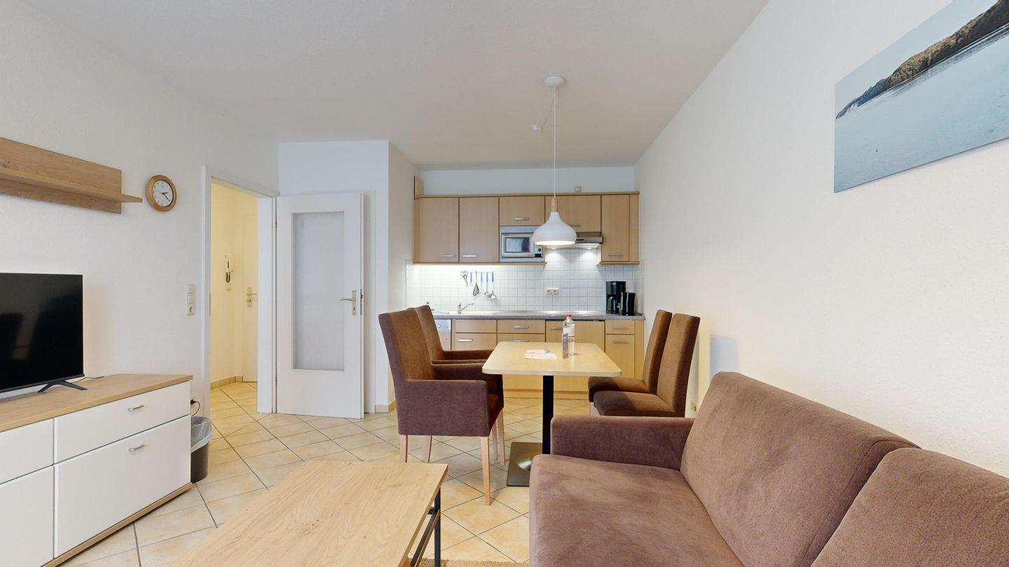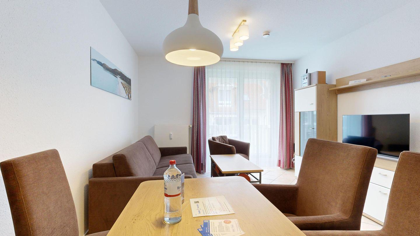 * Wohnzimmer: Couchgarnitur (Schlafgelegenheit für 2 Personen), Kabel-TV, Stereoanlage, Internetanschluss (WLAN), Esstisch