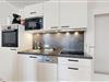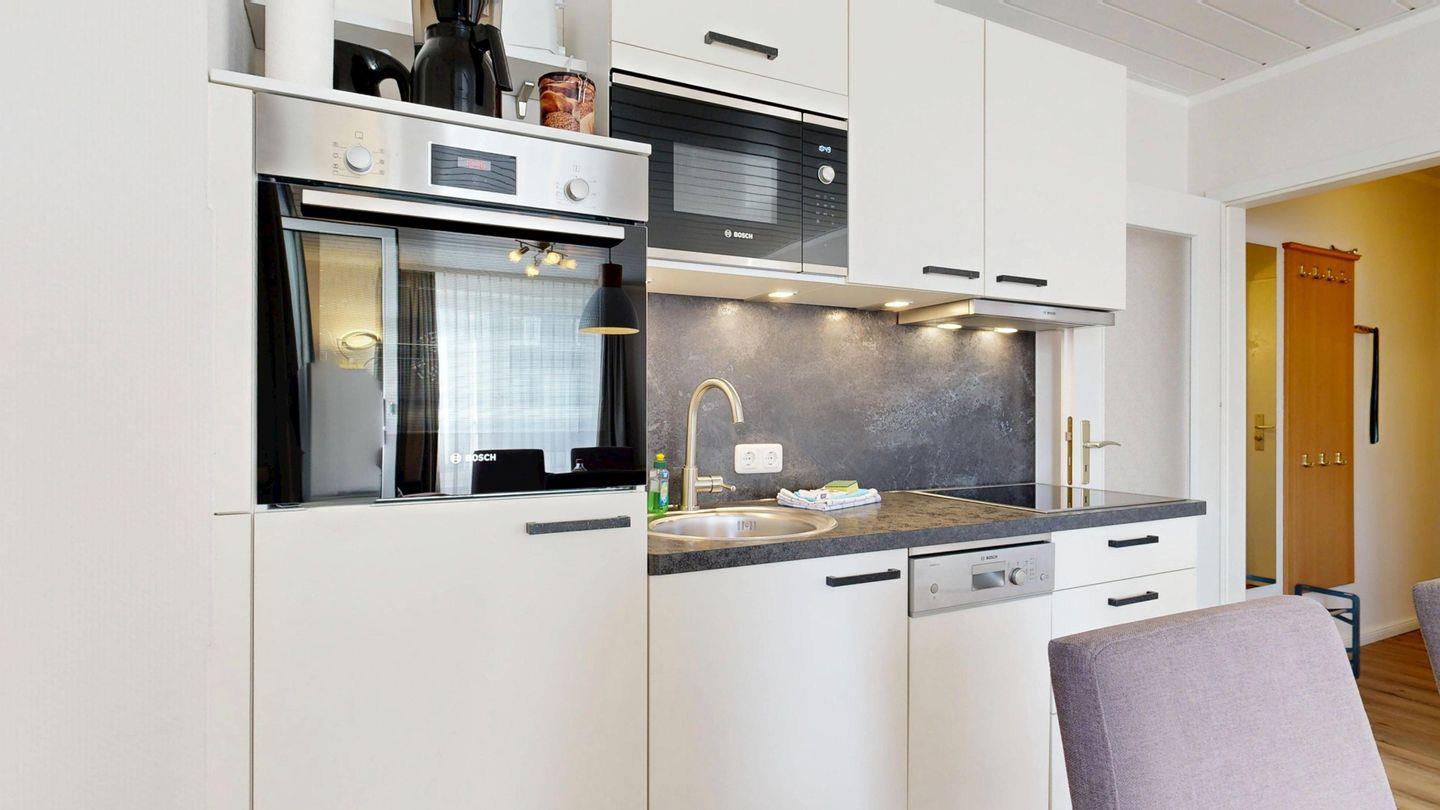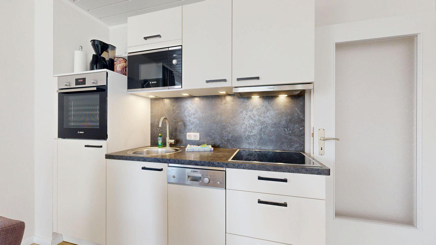 * Küchenzeile mit Spülmaschine, Ceranfeld, Mikrowelle, Kaffeemaschine, Toaster und Kühlschrank mit Gefrierfach