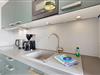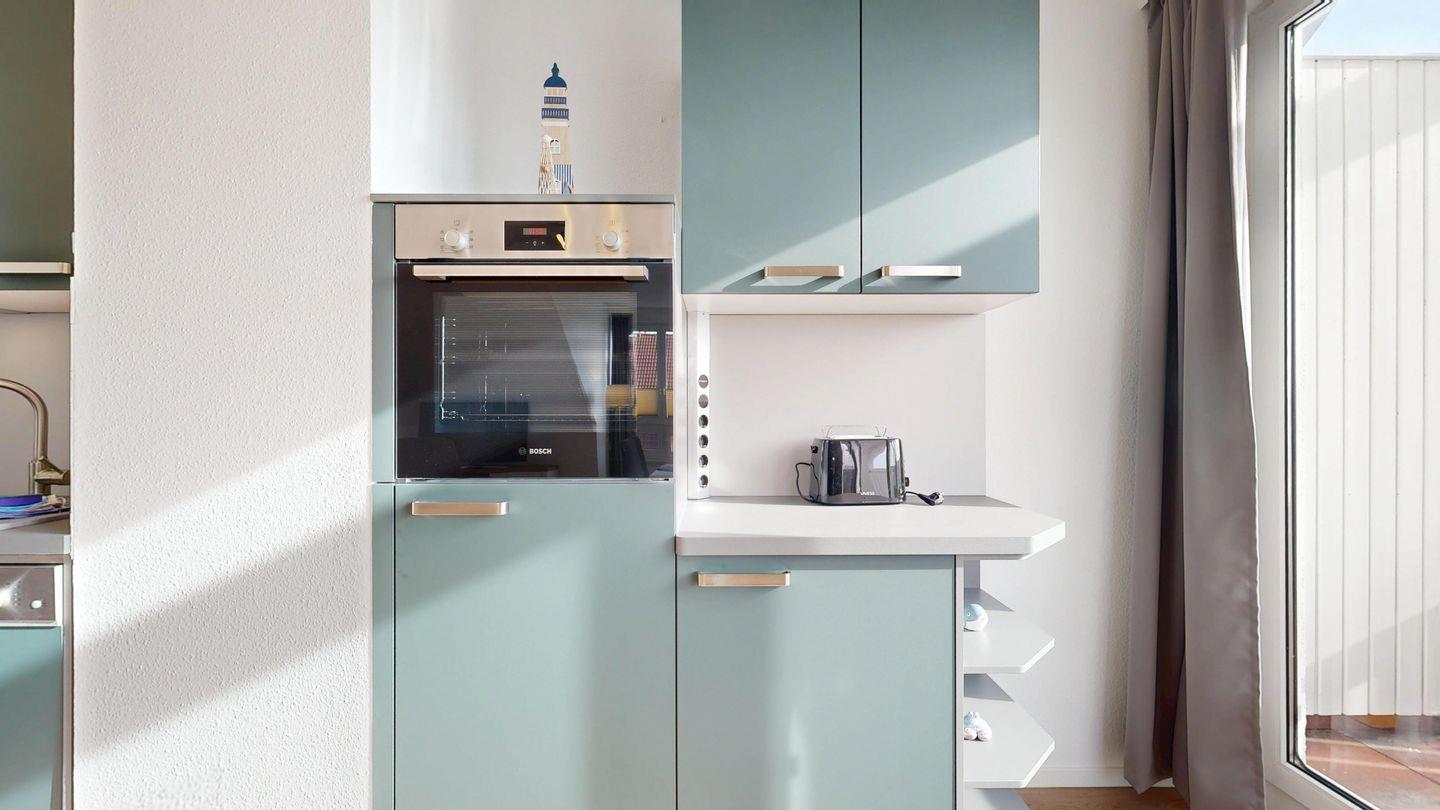 * Küchenzeile mit Spülmaschine, Ceranfeld, Mikrowelle, Kaffeemaschine, Toaster und Kühlschrank mit Gefrierfach