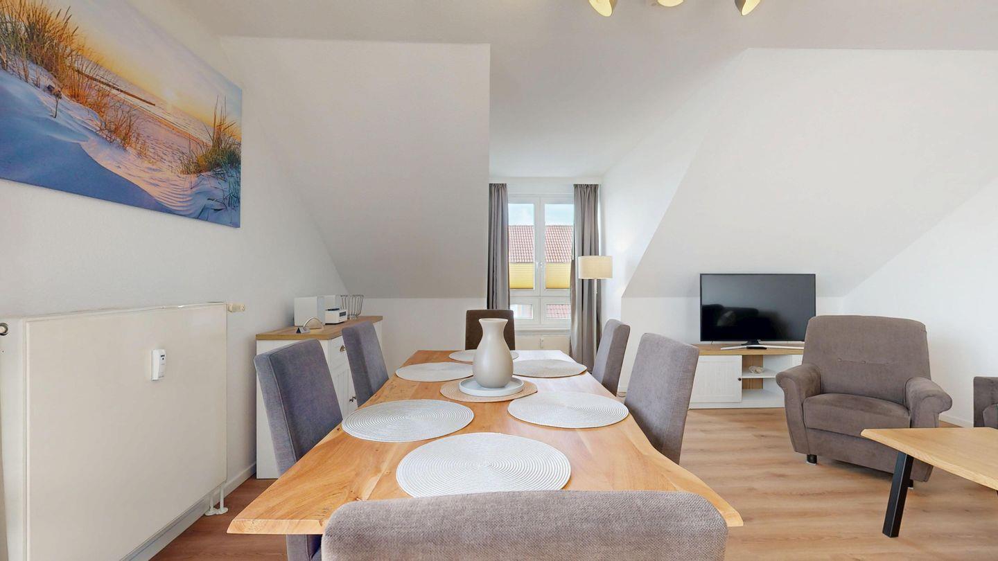 * Wohnzimmer: Couchgarnitur (Schlafgelegenheit für 2 Personen), Kabel-TV, Stereoanlage, Internetanschluss (WLAN), Esstisch