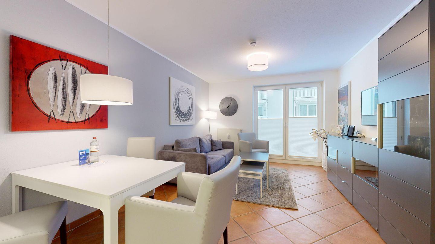 * Wohnzimmer: Couchgarnitur (Schlafgelegenheit für 2 Personen), Kabel-TV, Stereoanlage, Internetanschluss (WLAN), Esstisch