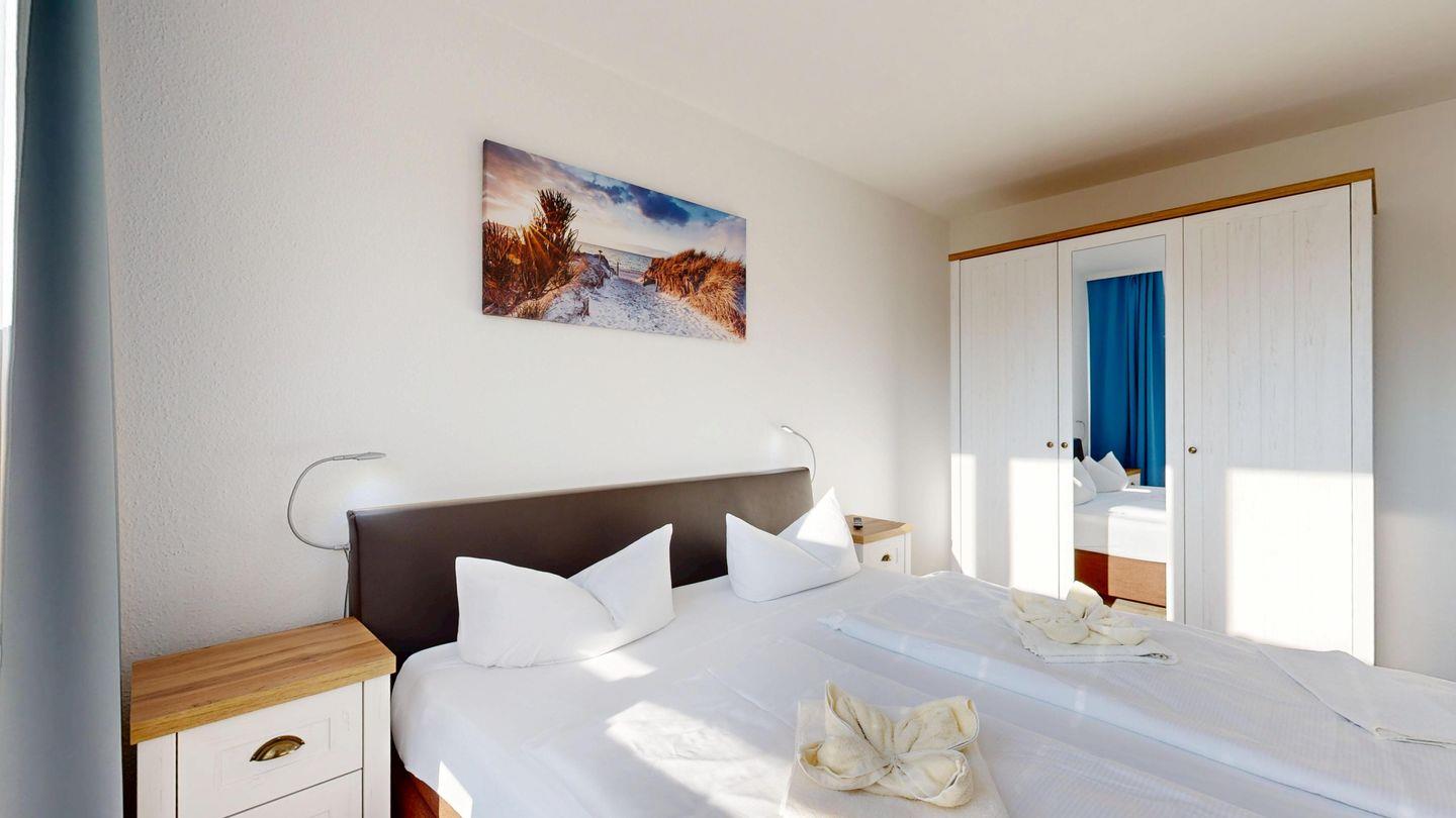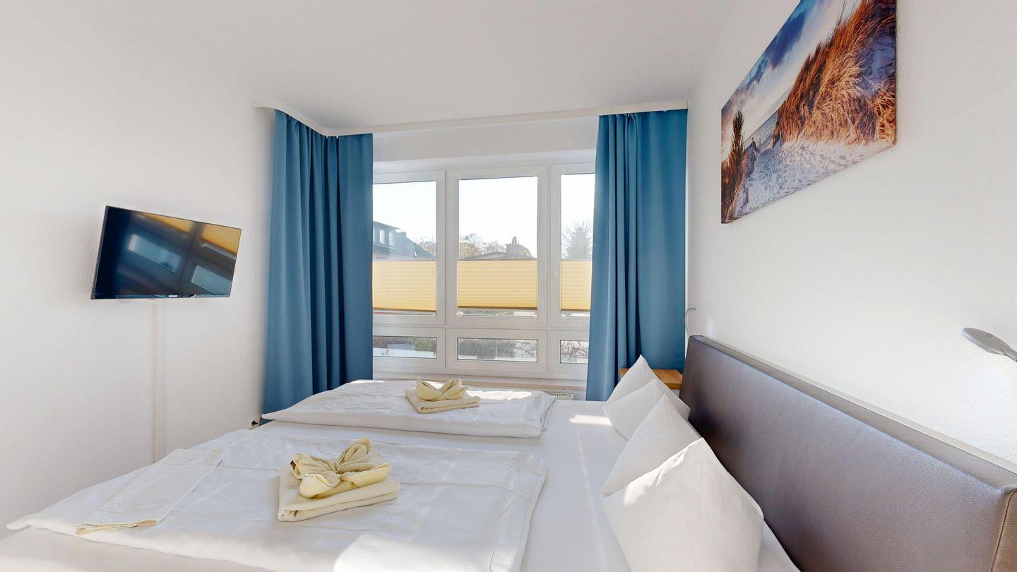 * 1 Schlafzimmer mit einem Boxspringbett (Doppelbett) und TV