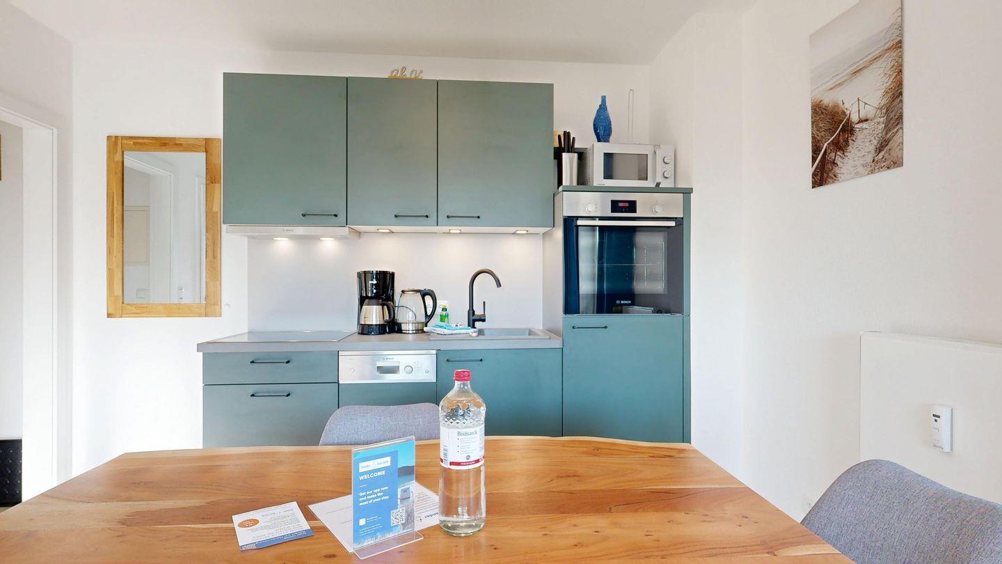 * Küchenzeile mit Spülmaschine, Backofen, Ceranfeld, Mikrowelle, Kaffeemaschine, Toaster und Kühlschrank mit Gefrierfach