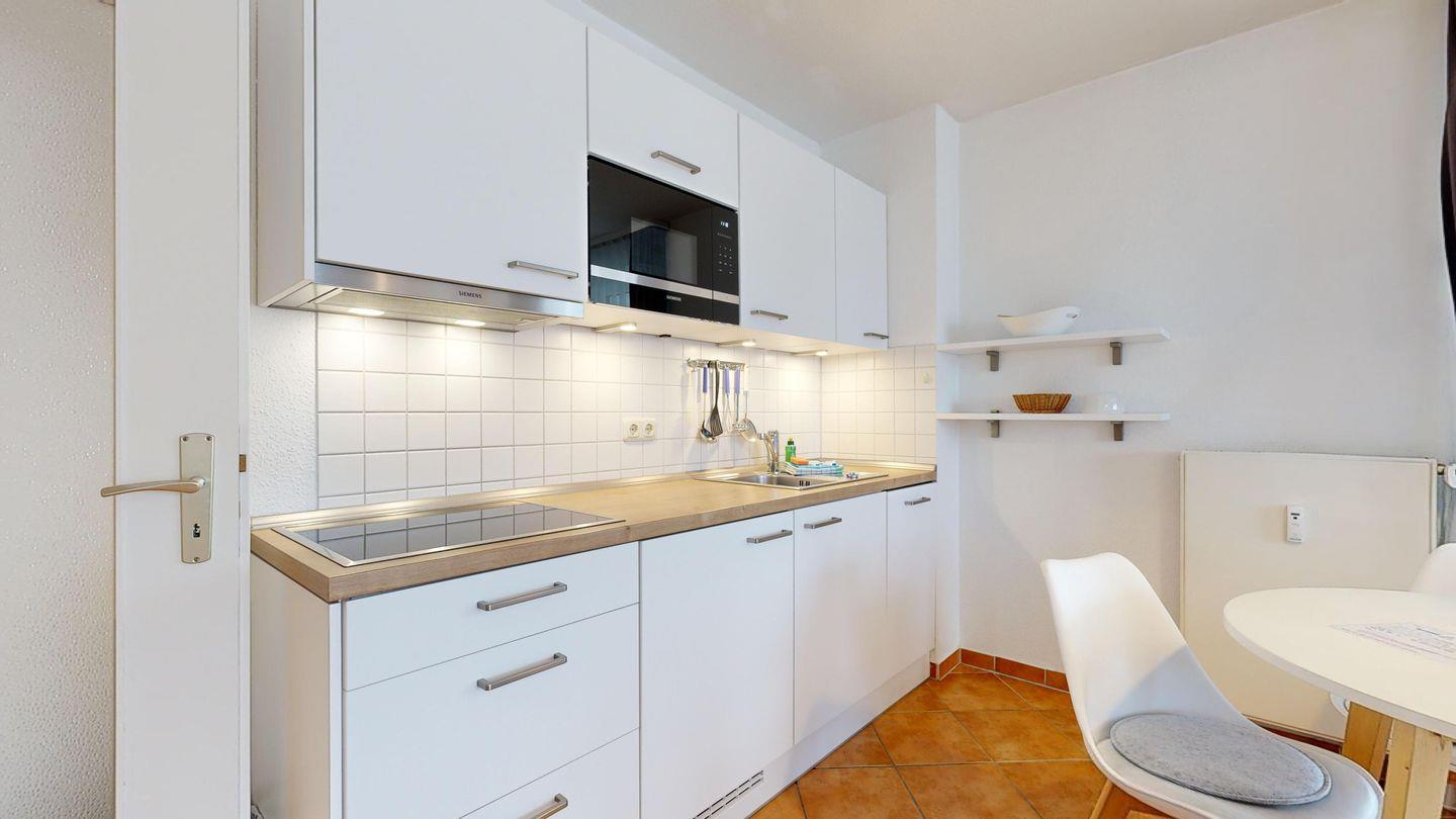 * Küchenzeile mit Spülmaschine, Ceranfeld, Mikrowelle mit Grillfunktion, Kaffeemaschine, Toaster und Kühlschrank mit Gefrierfach