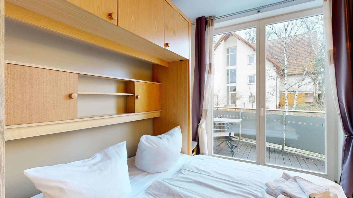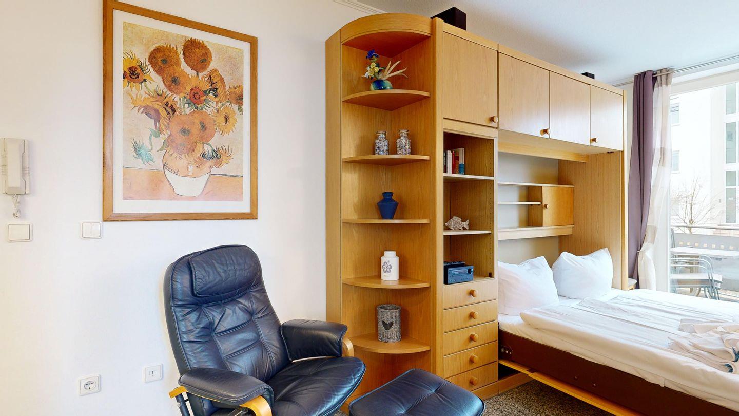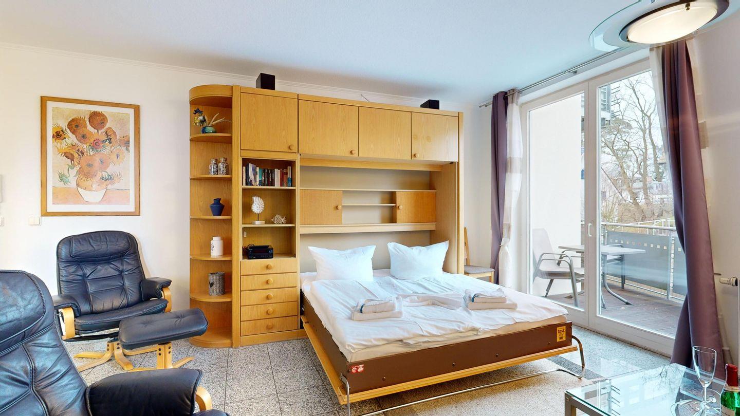 Charmantes Einraumappartement im Ostseebad Binz mit Schwimmbad, Sauna, Balkon und Tiefgarage, nur wenige Schritte vom Strand entfernt.