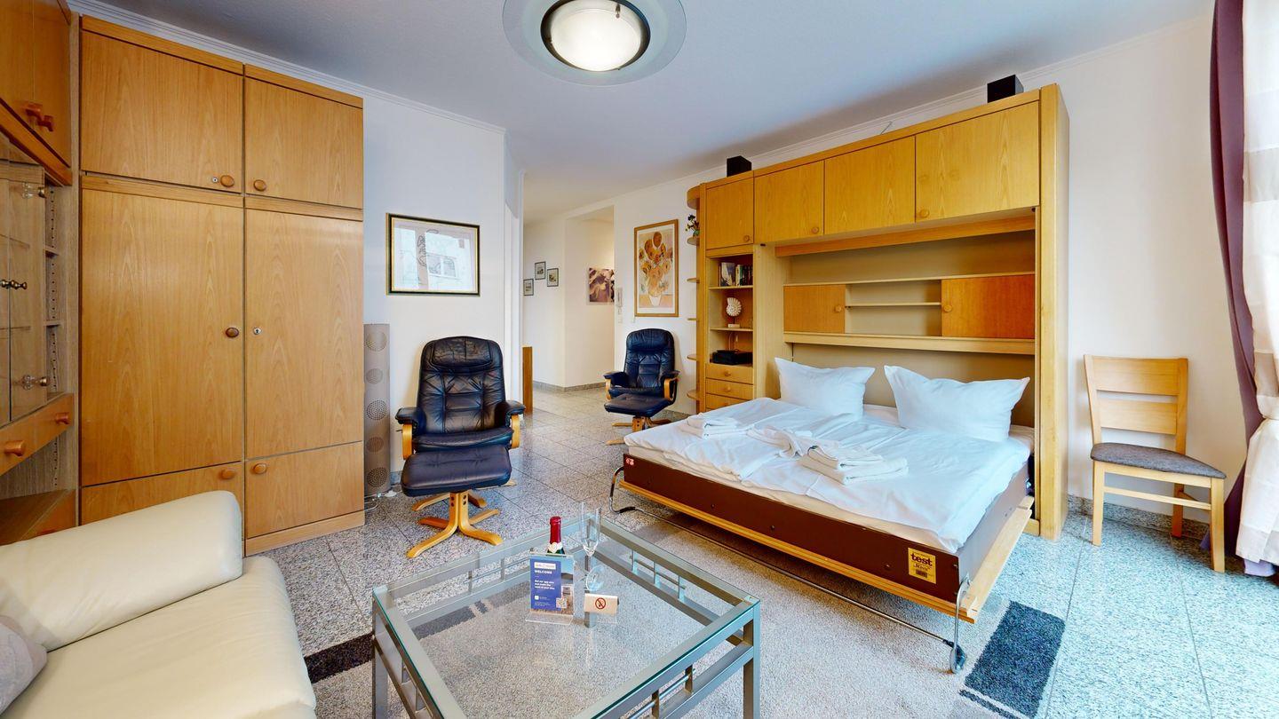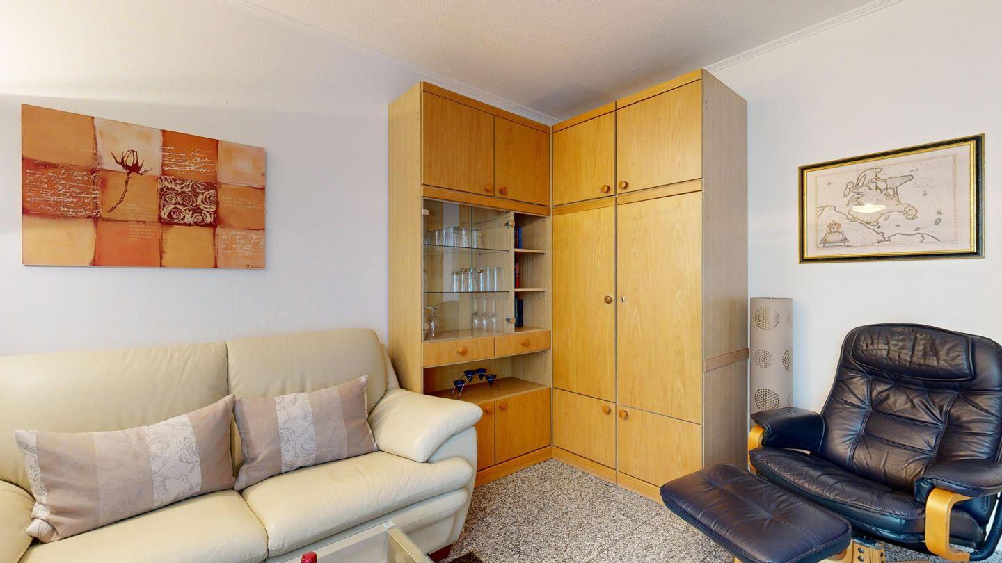 * Wohnzimmer: Couchgarnitur und 2 Sessel, Schrankbett, Kabel-TV, WLAN und Zugang zum Balkon
