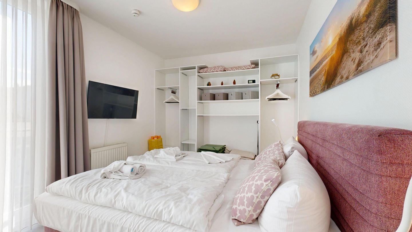 * 1 Schlafzimmer mit einem Doppelbett (Breite 1,60m), TV und Zugang zum Balkon