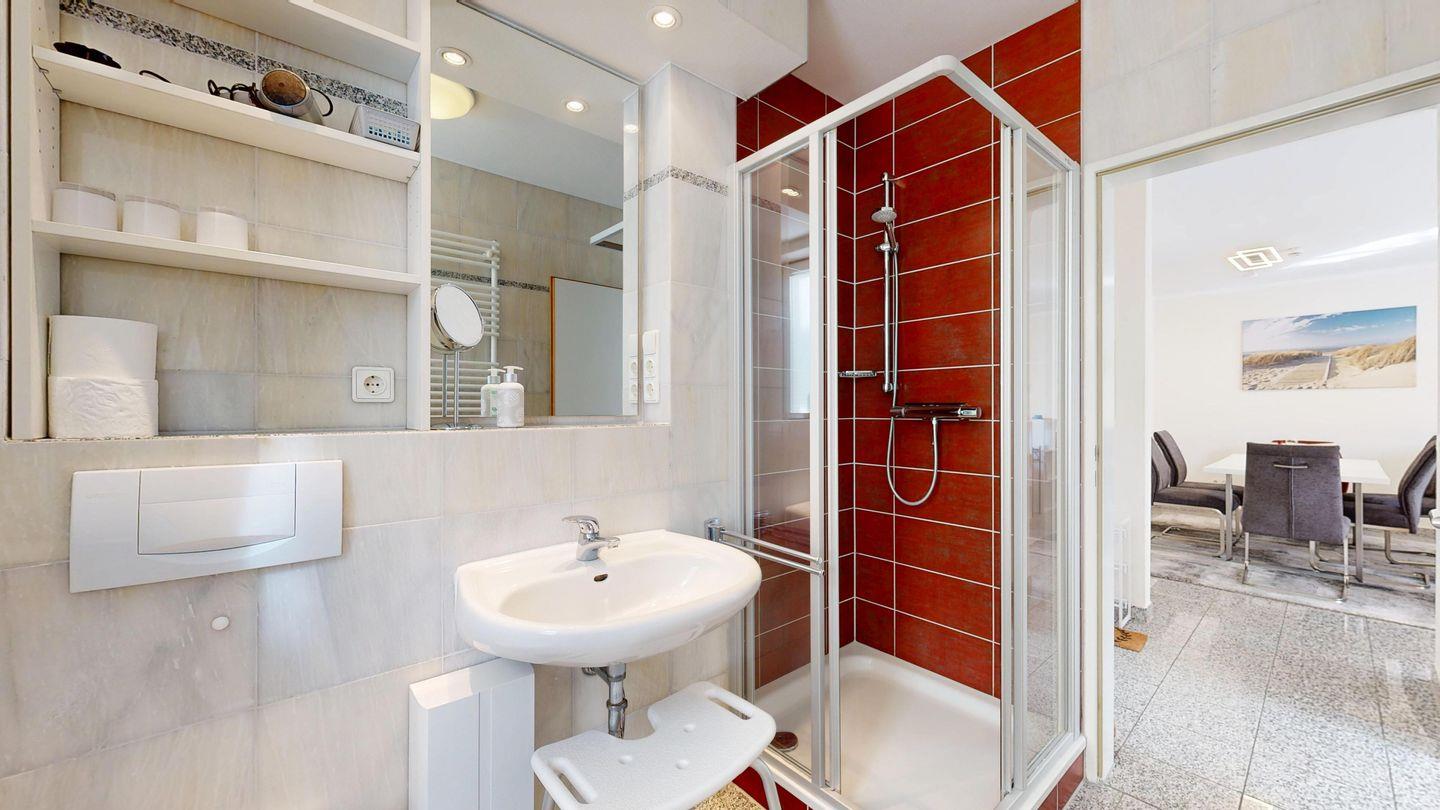 * 1 Badezimmer mit Dusche, WC, Föhn und Duschhocker