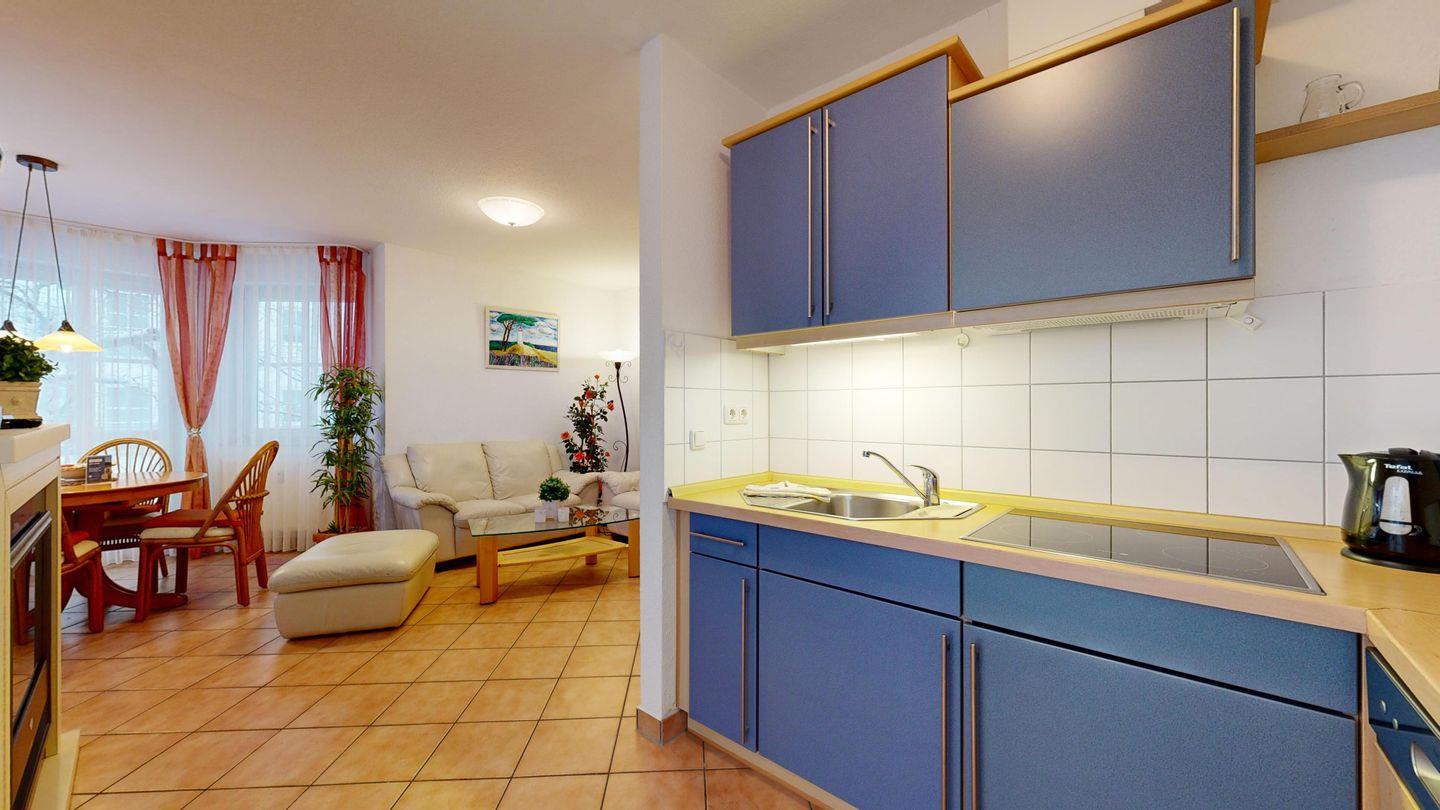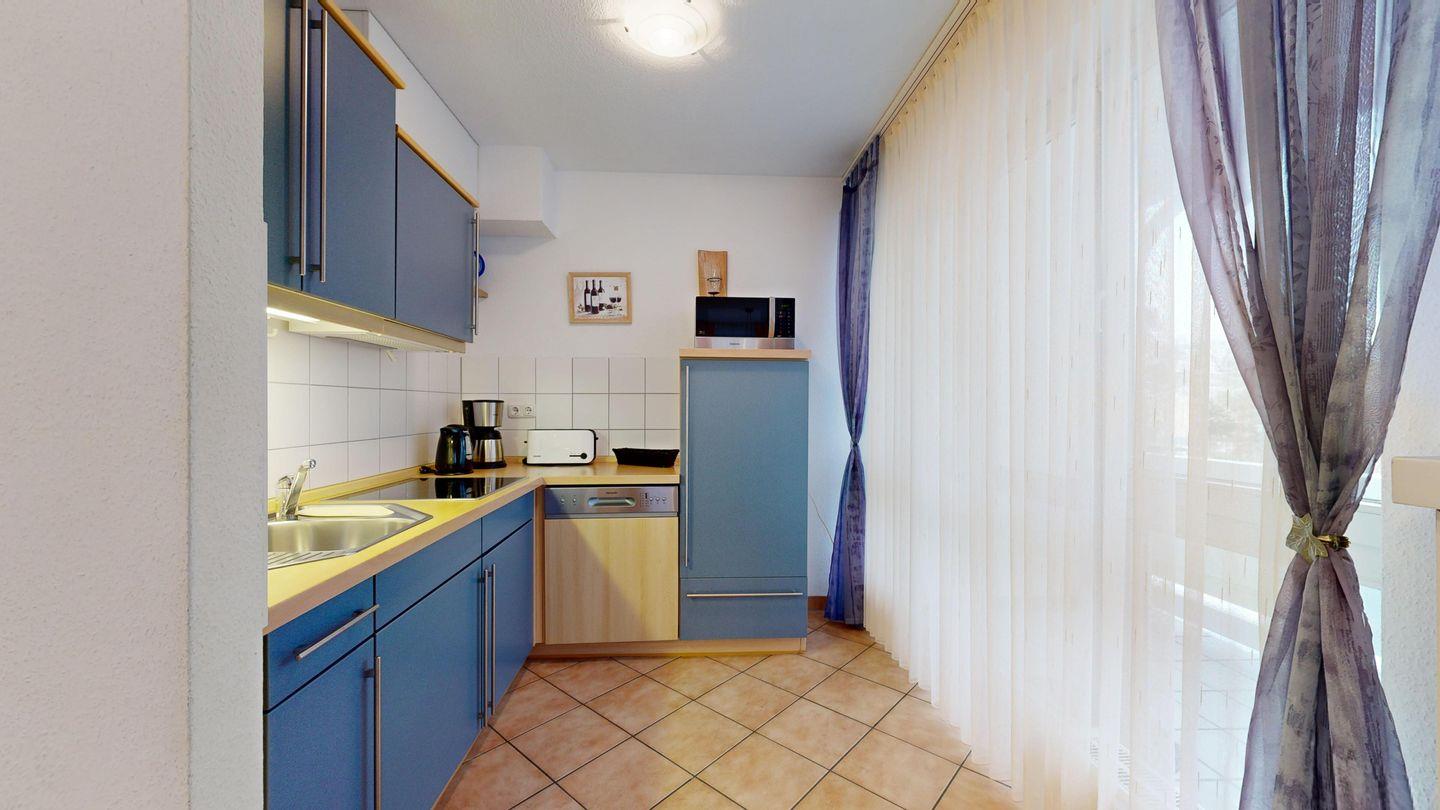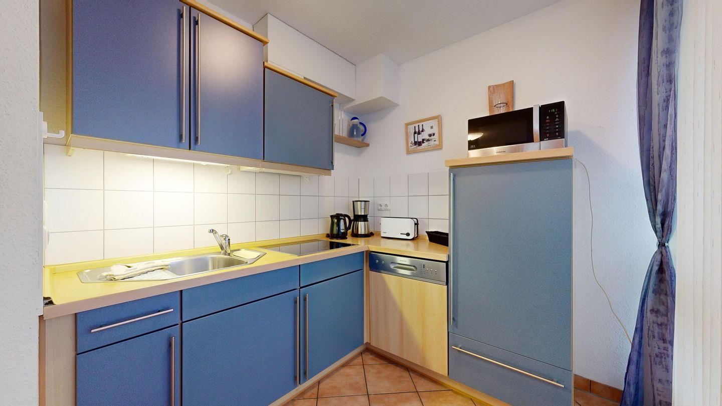 * Offene Wohnküche mit Spülmaschine, Cerankochfeld, Mikrowelle, Wasserkocher, Kaffeemaschine und Toaster