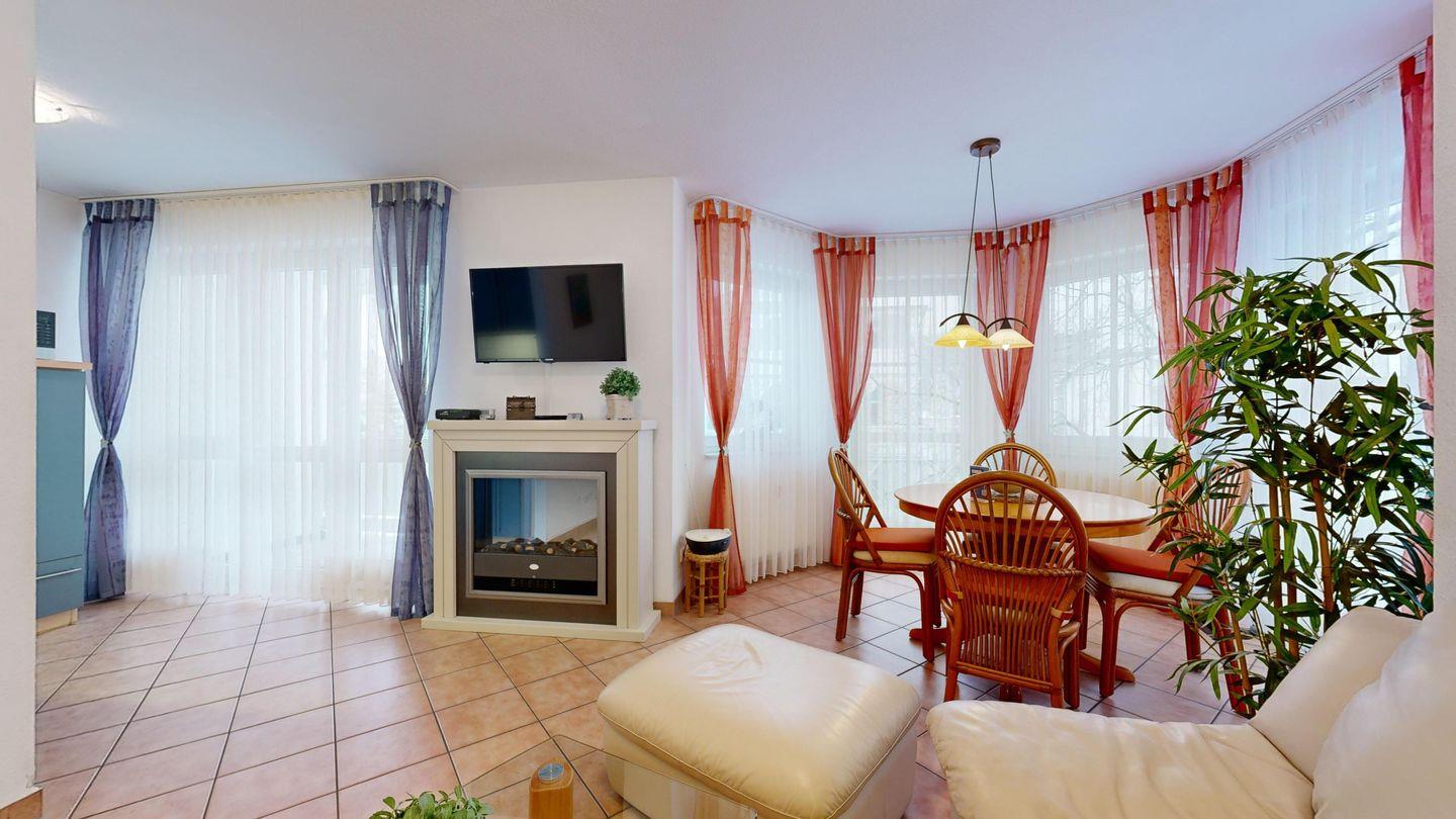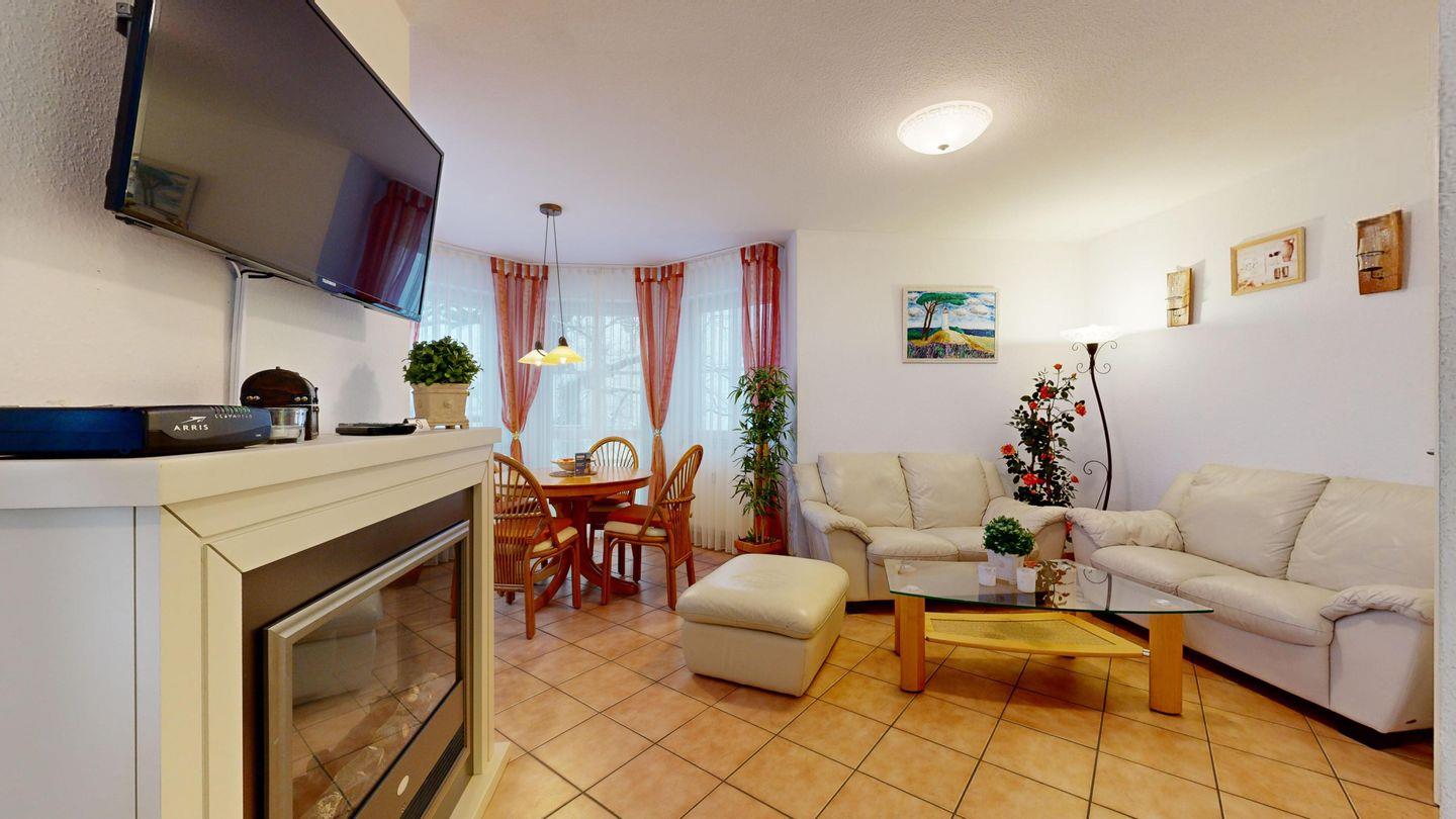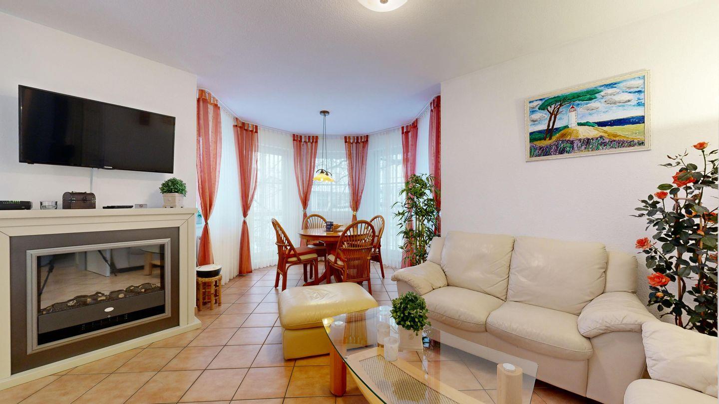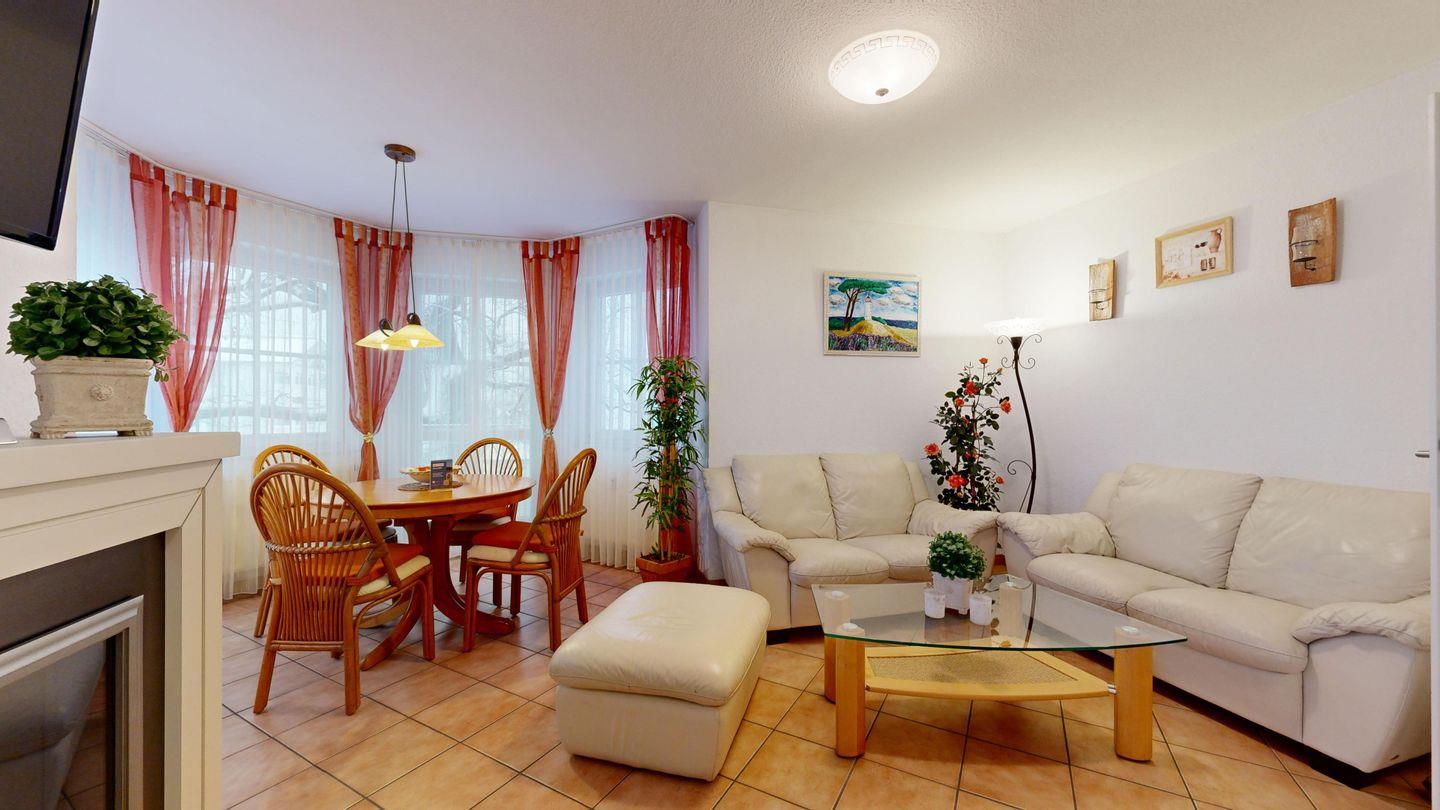 * Wohnzimmer: 2 Ledercouchen, Kabel-TV, Essplatz für 4 Personen im Erker, großer Elektrokamin und WLAN-Internetzugang; Ausgang zum Balkon