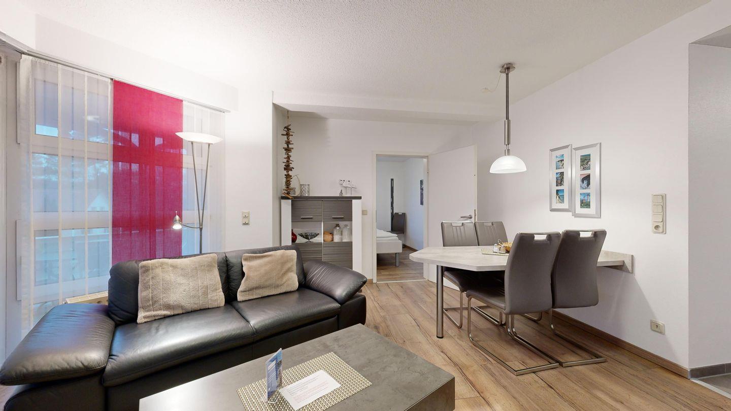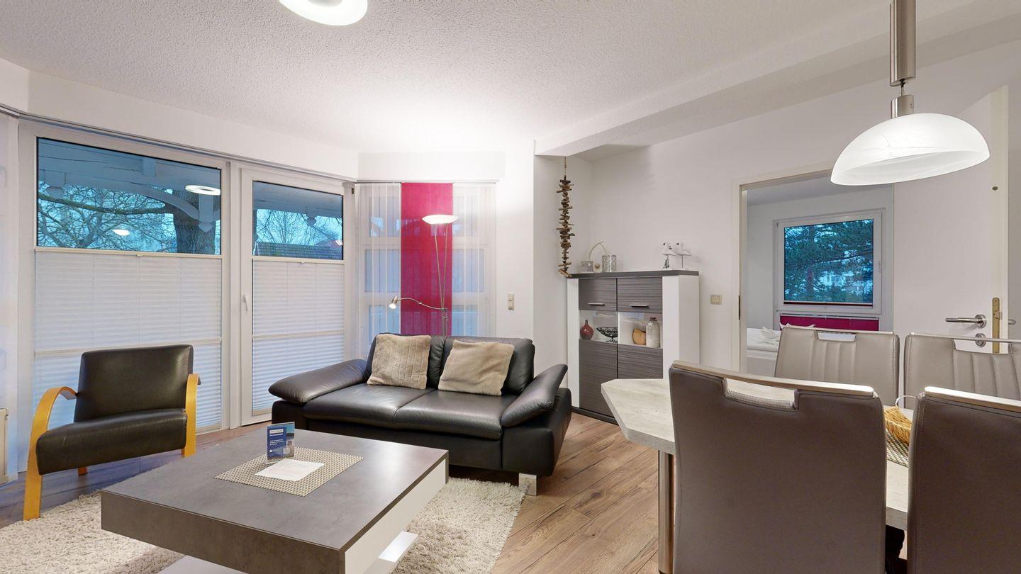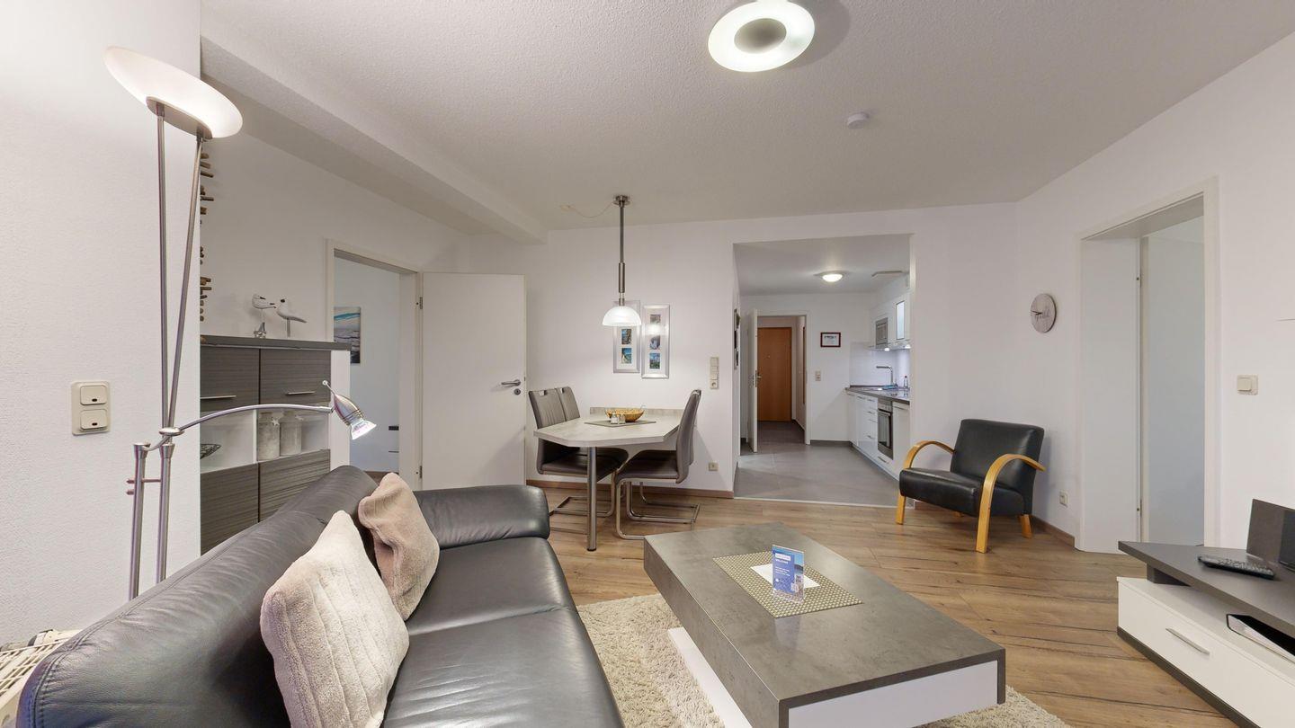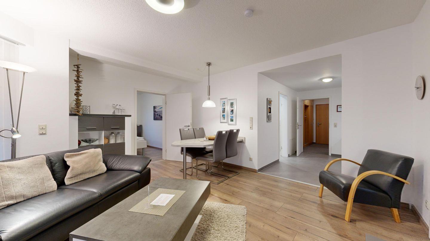 Nur einen Steinwurf vom Strand entfernt: Genießen Sie sonnige Stunden auf dem Südbalkon, entspannen Sie im eigenen Strandkorb und freuen Sie sich auf ein modernes Bad und zwei komfortable Schlafzimmer.
