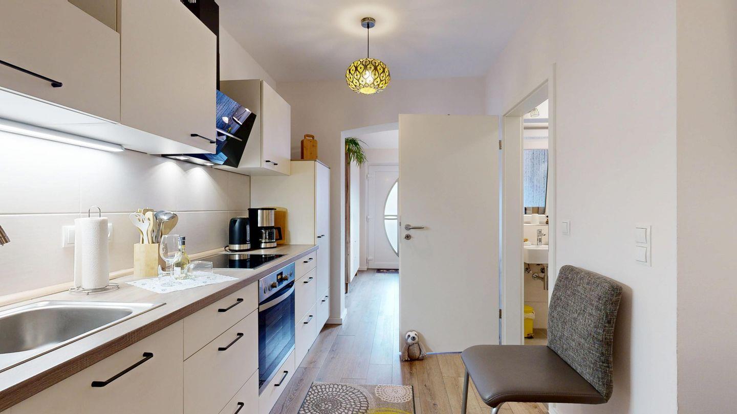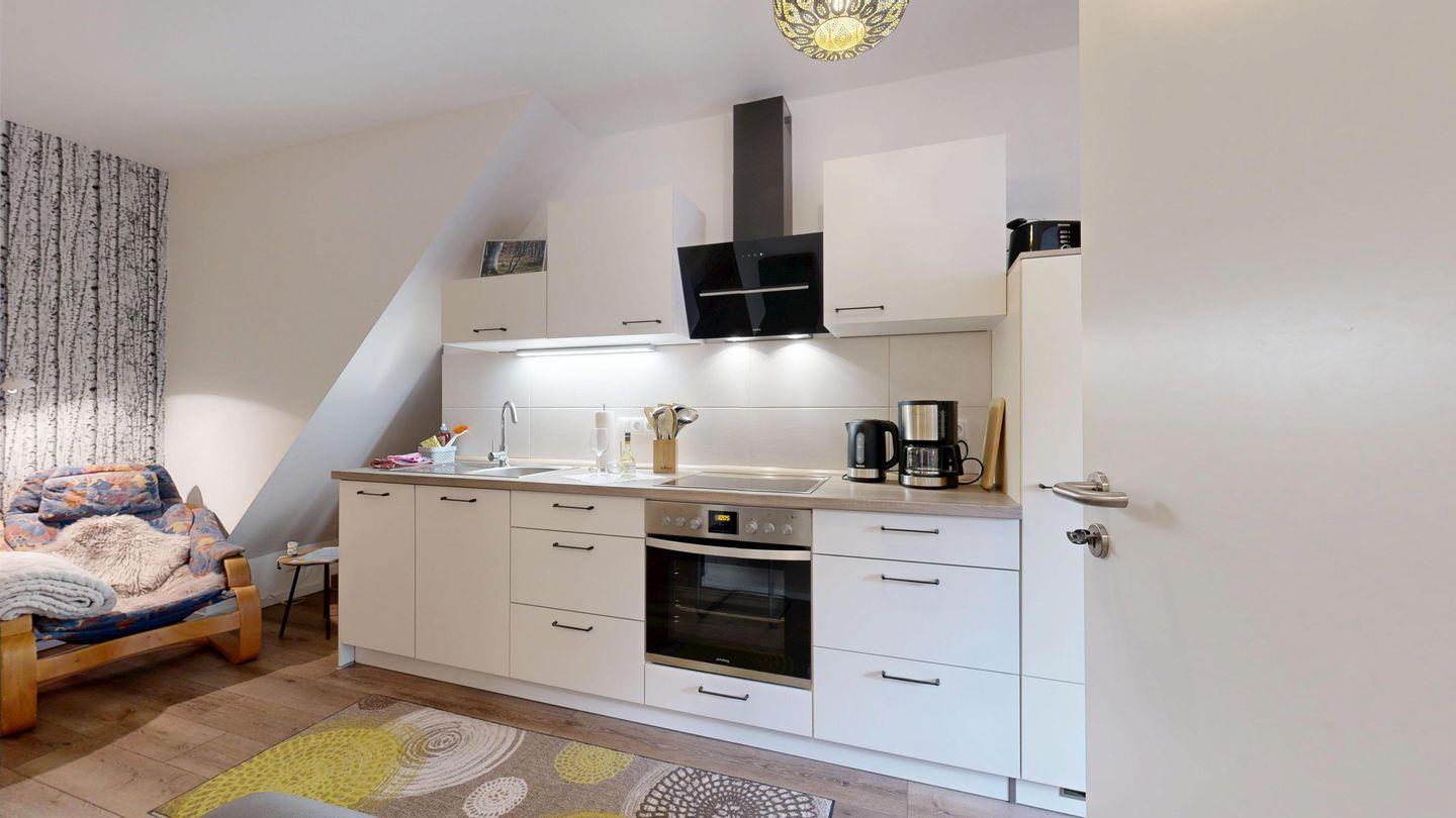* moderne Küchenzeile mit Spülmaschine, Cerankochfeld mit 4 Platten, Backofen, Toaster, Kaffeemaschine, Wasserkocher