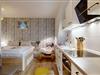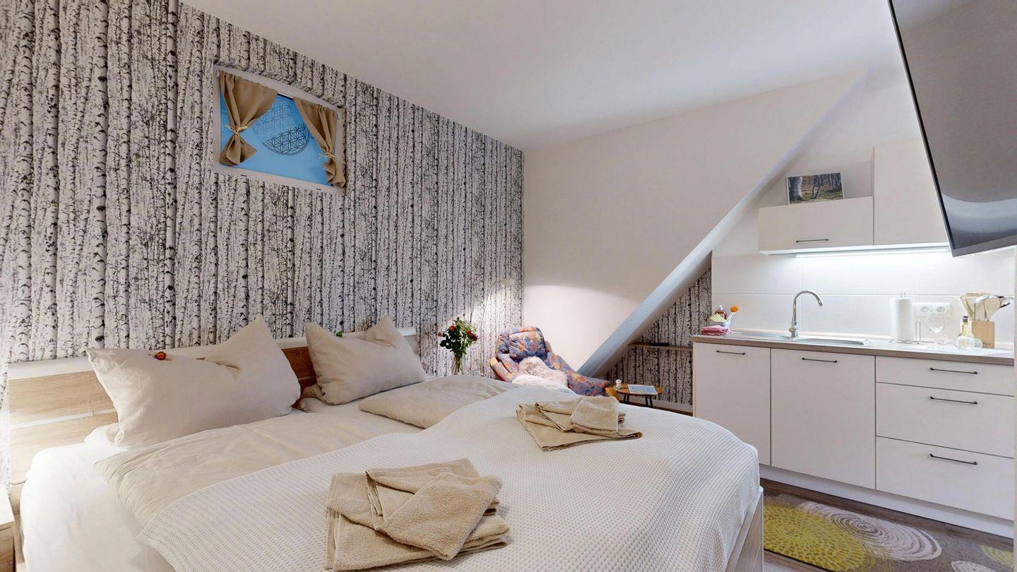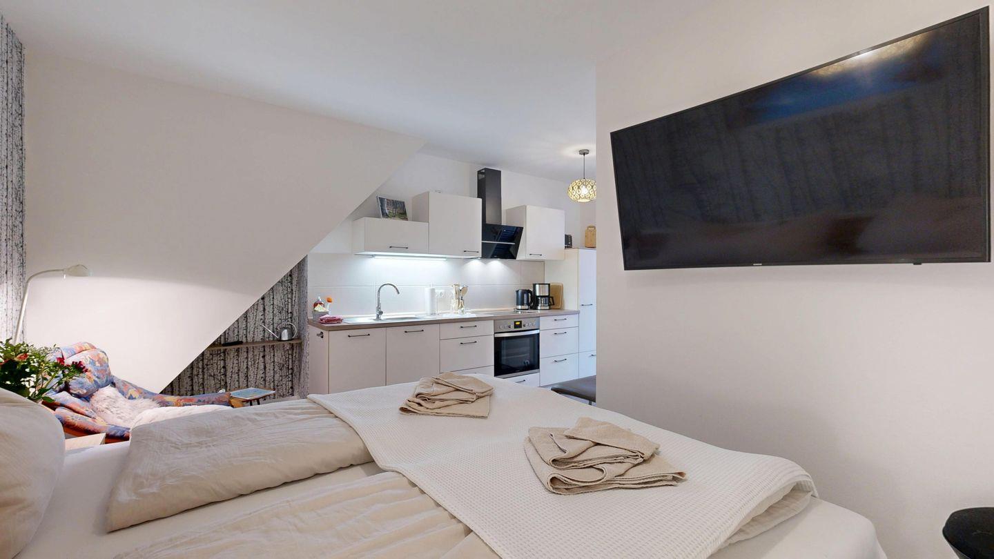 * Wohn-/Schlafraum: Doppelbett (1,80 m x 2,00 m), Kabel-TV (Flachbild), Esstisch mit gemütlicher Sitzecke