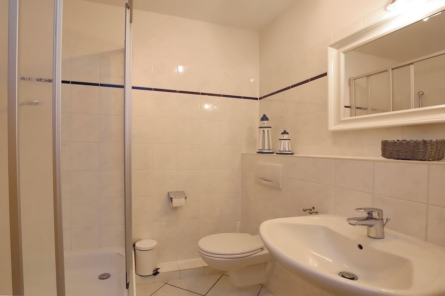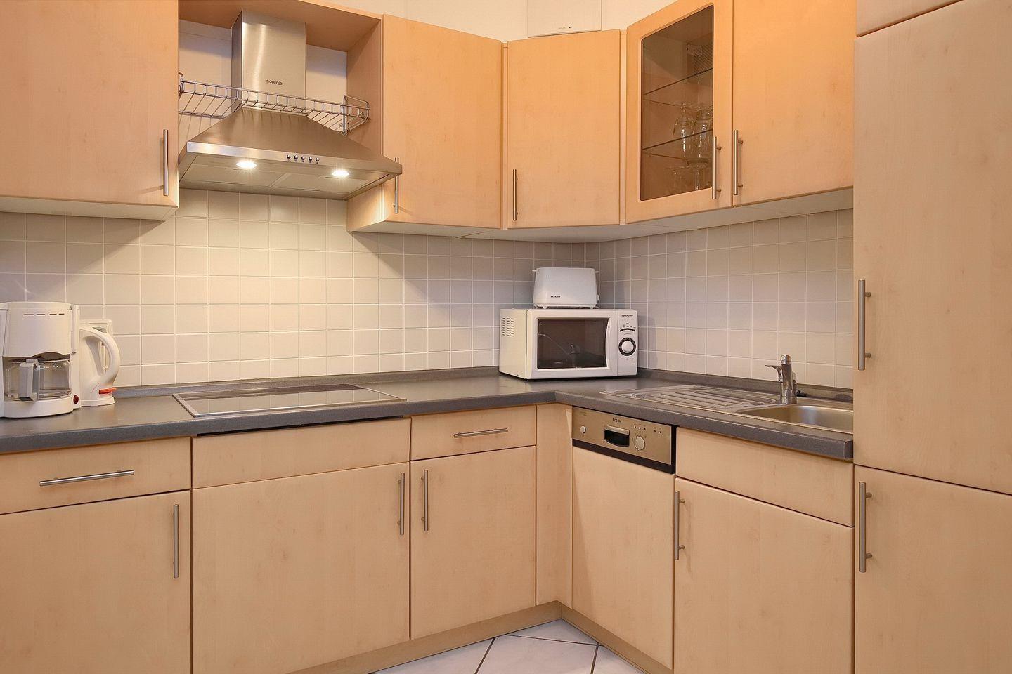 Die moderne Winkelküche mit einem Ceranfeld, Geschirrspüler, Kühlschrank mit Gefrierfach und Mikrowelle ist zum Wohnraum hin offen. Zur Wohnung gehört ein funktionelles, gefliestes Duschbad. In dieser Nichtraucherferienwohnung sind auch Haustiere nicht erwünscht.
