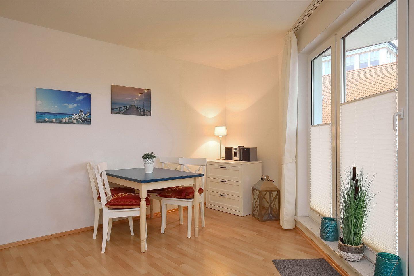 Hier ist der Name Programm. Auf dem Balkon steht ein Strandkorb, von dem du direkten Blick auf das Kurhaus sowie den Kurpark hast. Die Flaniermeile des Ortszentrums liegt dir hier zu Füßen. Bei dieser abwechslungsreichen Aussicht kannst du so manchen Kaffee genießen. Das Wohnzimmer teilt sich in Wohn- und Essbereich auf. Eine Couch, zwei Sessel und ein Flachbildfernseher gehören genauso zur Ausstattung wie der Esstisch mit 4 Stühlen und ein Sideboard. Eine Belegung der Ferienwohnung mit 4 Personen wird durch die ausziehbare Doppelschlafcouch (150 x 190 cm) ermöglicht.
