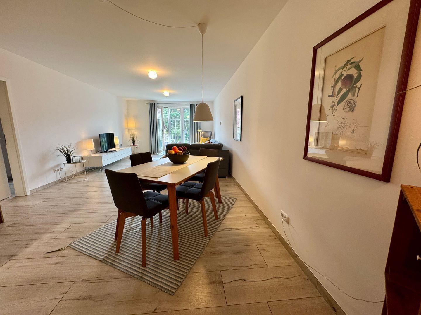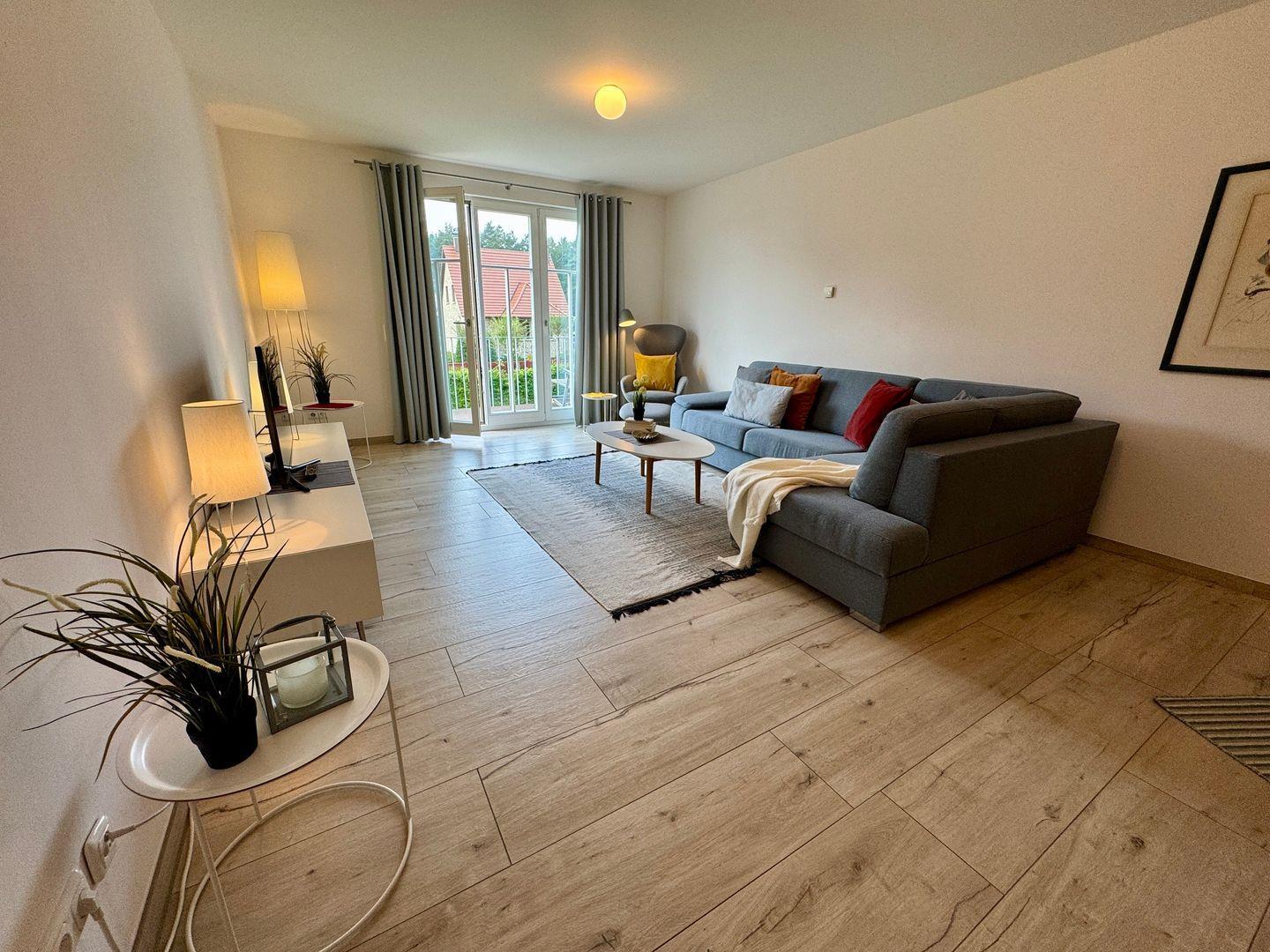 Dieses 74 m² große Appartement im Obergeschoss bietet Platz für bis zu 4 Personen und ist der ideale Ort für eine entspannte Auszeit. Das helle und freundliche Wohnzimmer ist mit einer Schlafcouch ausgestattet, die bequem Platz für 2 Personen bietet. So können Sie den gemeinsamen Urlaub in geselliger Runde genießen, ohne auf den Komfort einer eigenen Schlafgelegenheit zu verzichten. In der integrierten Küchenzeile haben Sie alles, was Sie benötigen, um leckere Mahlzeiten zuzubereiten – ideal, um gemeinsam mit Ihren Lieben zu kochen und zu genießen. Das Schlafzimmer bietet mit einem einladenden Doppelbett (2 x 2 Meter) viel Platz für 2 weitere Personen, sodass Sie nach einem erlebnisreichen Tag erholsamen Schlaf finden können. Das Badezimmer ist eine wahre Wellness-Oase und lädt mit einer Dusche, einem WC sowie einer Sauna zum Entspannen ein. Genießen Sie entspannte Momente und lassen Sie den Alltag hinter sich. Auf dem Balkon können Sie die lauen Sommerabende bei frischer Luft genießen und den Tag ausklingen lassen. Ein Pkw-Stellplatz innerhalb der Anlage steht Ihnen zur Verfügung, sodass Sie Ihr Fahrzeug bequem parken können. Haustiere sind im Appartement leider nicht gestattet, und das Rauchen ist ebenfalls nicht erlaubt. Für Ihre digitale Kommunikation steht Ihnen während Ihres Aufenthalts kostenloses W-LAN zur Verfügung.