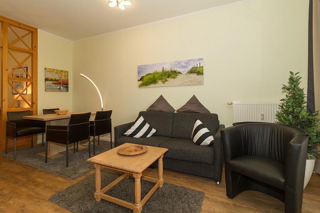 Das Nichtraucher-Apartment verfügt über kostenfreies WLAN und eine voll ausgestattete offene Küche mit Geschirrspüler, Mikrowelle, Wasserkocher, Kaffeemaschine, Toaster und Tiefkühlfach. Der kombinierte Wohn- und Essbereich verfügt über eine TV-HiFi-Anlage mit Flachbild-TV. Sowohl der Esstisch, als auch der behagliche Sitzbereich mit Schlafcouch bieten genügend Platz, um schöne Stunden beim Frühstück oder nach einem ereignisreichen Tag am Strand zu verbringen. Das separate Schlafzimmer ist ausgestattet mit einem großen Boxspringbett (2 x 0,90 x 2,00). Das Schlafzimmerfenster liegt zum Atrium, dem begrünten, überdachten Innenhof des Gebäudes. Die Wohnung verfügt über eine kleine, überdachte Terrasse in Ost-Lage.