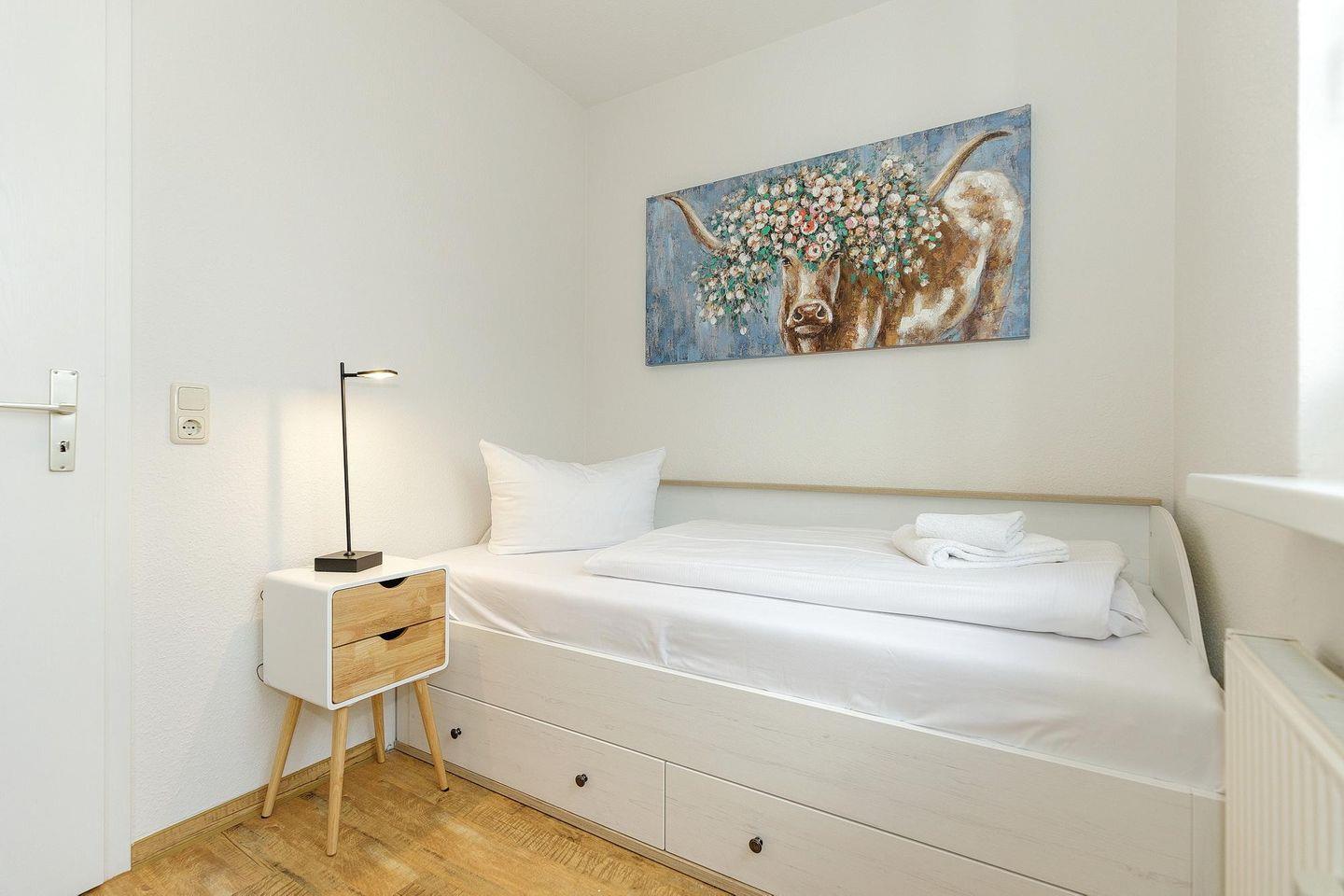 Das familienfreundliche Ferienapartment verfügt über ein Schlafzimmer mit Doppelbett und ein Schlafzimmer mit Einzelbett. Ein Kinderbett kann gegen Entgelt aufgestellt werden und auf Wunsch könnt ihr einen Hochstuhl hinzubuchen.