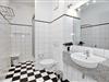 Das geflieste Badezimmer verfügt über eine Dusche, ein Waschbecken, einen Föhn und ein WC.