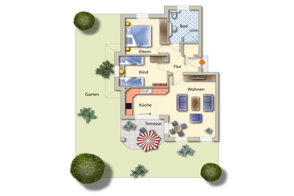 Parterre: (Eingangshalle(, Heizung), Küche(, , , Kochplatte, Wasserkocher, Toaster, Kaffeemaschine, Backofen, Spülmaschine, Kühlschrank, Tiefkühlschrank, Heizung), Wohn/Esszimmer(, Bibliothek, TV, Esstisch, Heizung), Schlafzimmer(, Doppelbett, Heizung, Fliegenfenster), Schlafzimmer(Einzelbett, Einzelbett, Heizung, Fliegenfenster), Badezimmer(, Toilette, Dusche, Waschbecken, Heizung, Föhn, Fliegenfenster), Abstellraum(, Hochstuhl, Bügelbrett, Bügeleisen, Trockenschrank)) , , Abstellraum, Internet, Heizung(Zentral), Terrasse(, Gartenmöbel, Liegen), Parkplatz, Sonnenschirm, Bügelbrett, Bügeleisen, Trockenschrank