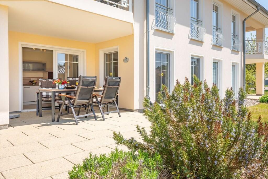 Liebevoll eingerichtete Ferienwohnung im Erdgeschoss für 4 Personen in attraktiver Bäderstil-Villa (nur 4 Wohnungen im Haus) in ruhiger Lage (Sackgasse) mit Waldblick. Die Entfernung zum 3 km langen Sandstrand beträgt ca. 800m. Die Wohnung liegt sehr ruhig am Stadtwald. Geschäfte, Bank, Restaurants, Apotheke etc. sind ebenfalls fußläufig zu erreichen. -Komplett ausgestattete Küche - Wohn- und Esszimmer - 1 Schlafzimmer mit Doppelbett 180x200 cm - 1 Schlafzimmer mit 2 Einzelbetten 0,90x200 cm - 1 Bad mit ebenerdiger Dusche und WC - 1 Abstellraum - Terrasse (Süd/West) - Kinderbett u. Hochstuhl kostenlos - Wlan kostenlos Fußbodenheizung in der gesamten Wohnung Zur Wohnung gehört ein eigener PKW-Stellplatz sowie ein Fahrrad-Schuppen.