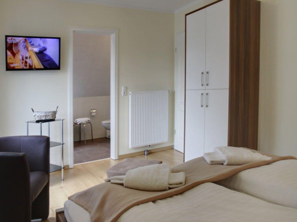 1 Schlafzimmer mit Doppelbett (1,80x2,00m), TV, verstellbare Lattenroste, eigenes Bad mit Wanne/ebenerdiger Dusche