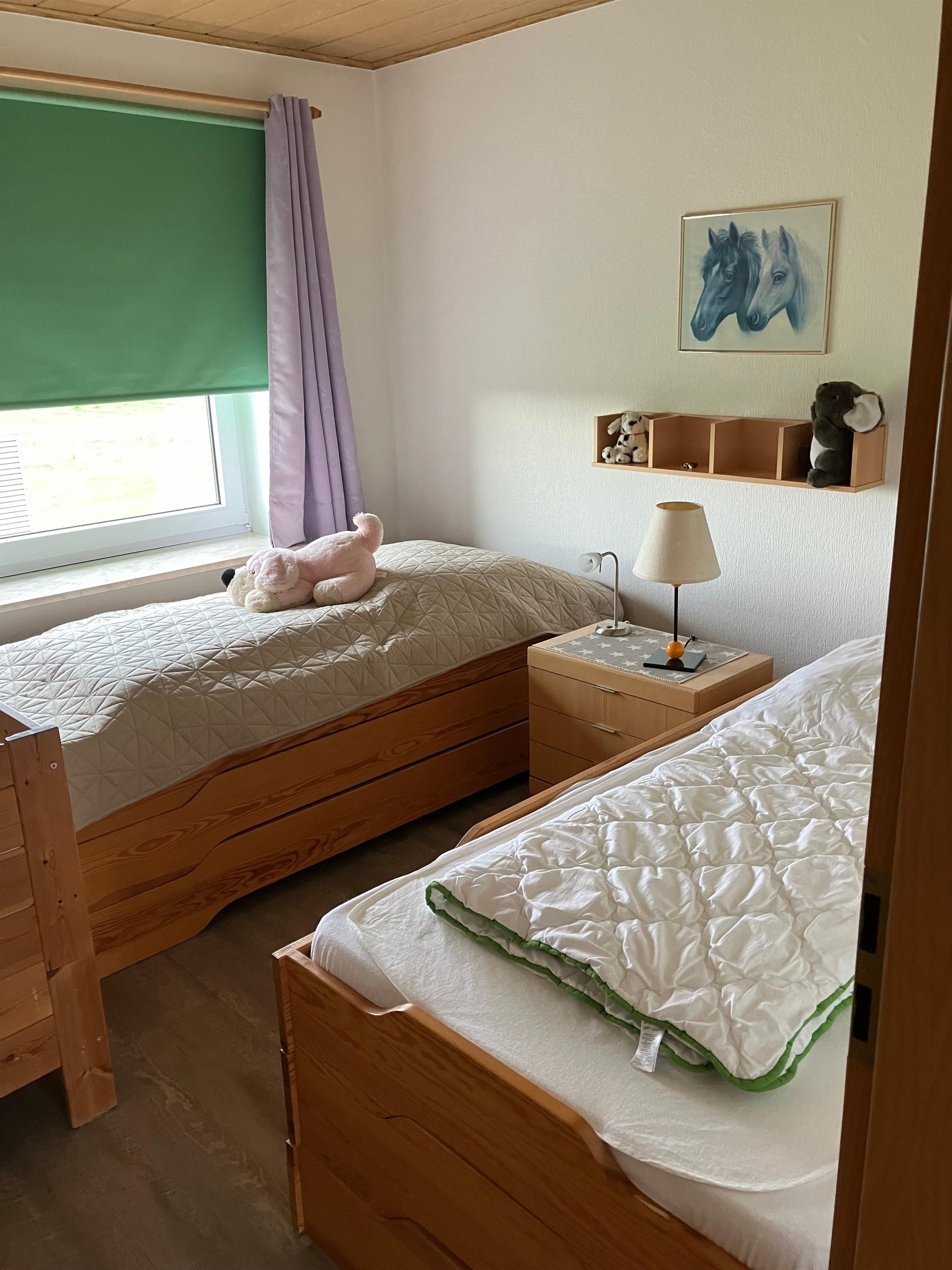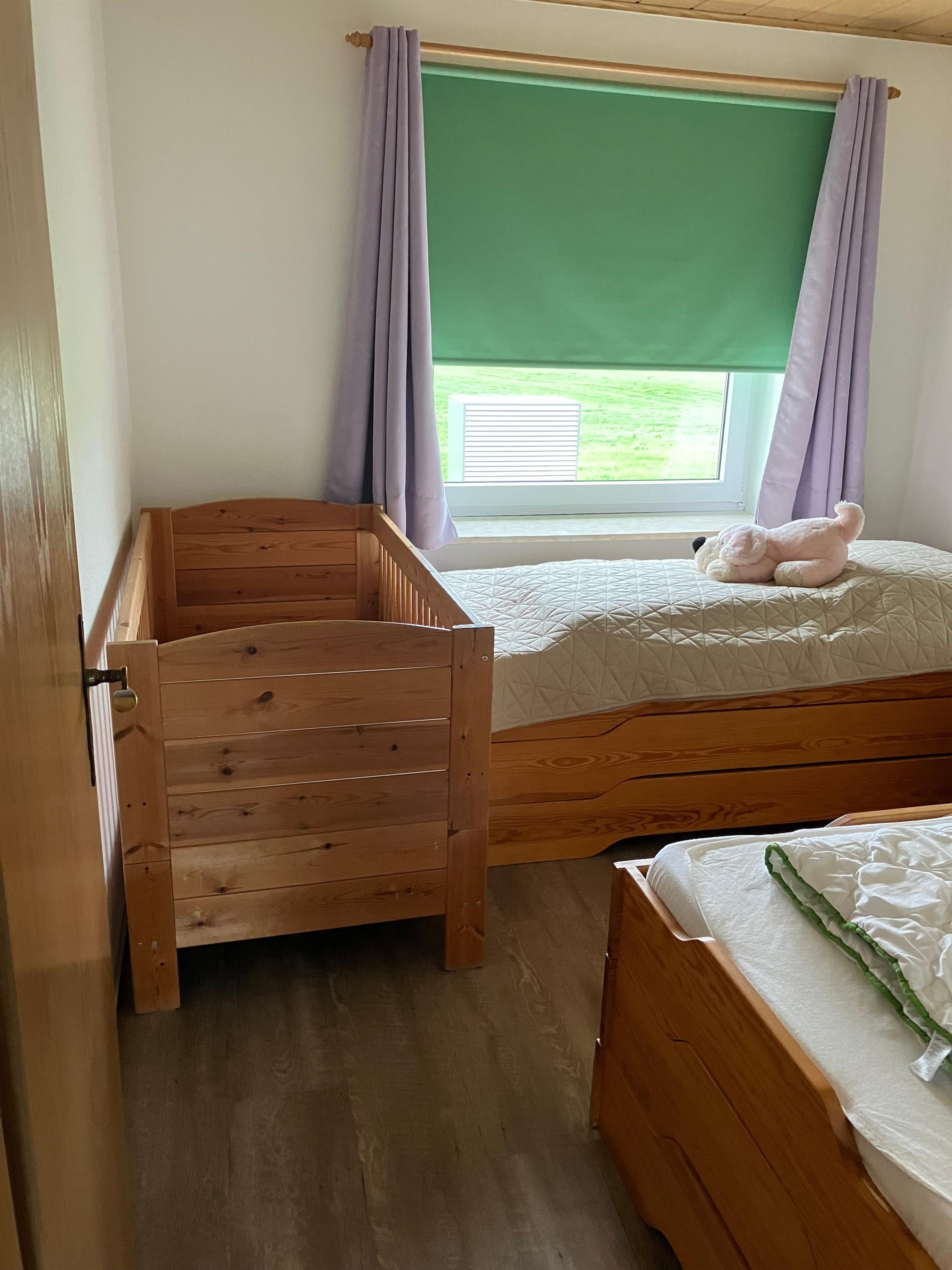 Die Ferienwohnung verfügt über einen gemütlichen Wohnbereich mit Küchenzeile und großem Esstisch. Der Küchenbereich ist voll ausgestattet. Zudem verfügt die Wohnung über zwei Schlafzimmer, eines mit gemütlichem Doppelbett, das andere mit zwei Einzelbetten. Ein Kinderbett ist zusätzlich vorhanden. Eine Terrasse gehört ebenfalls zum Angebot.