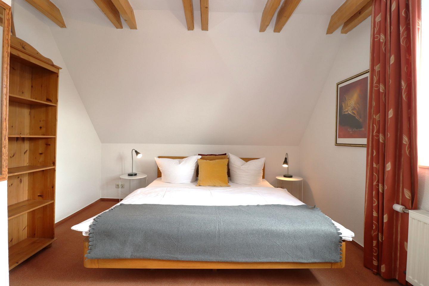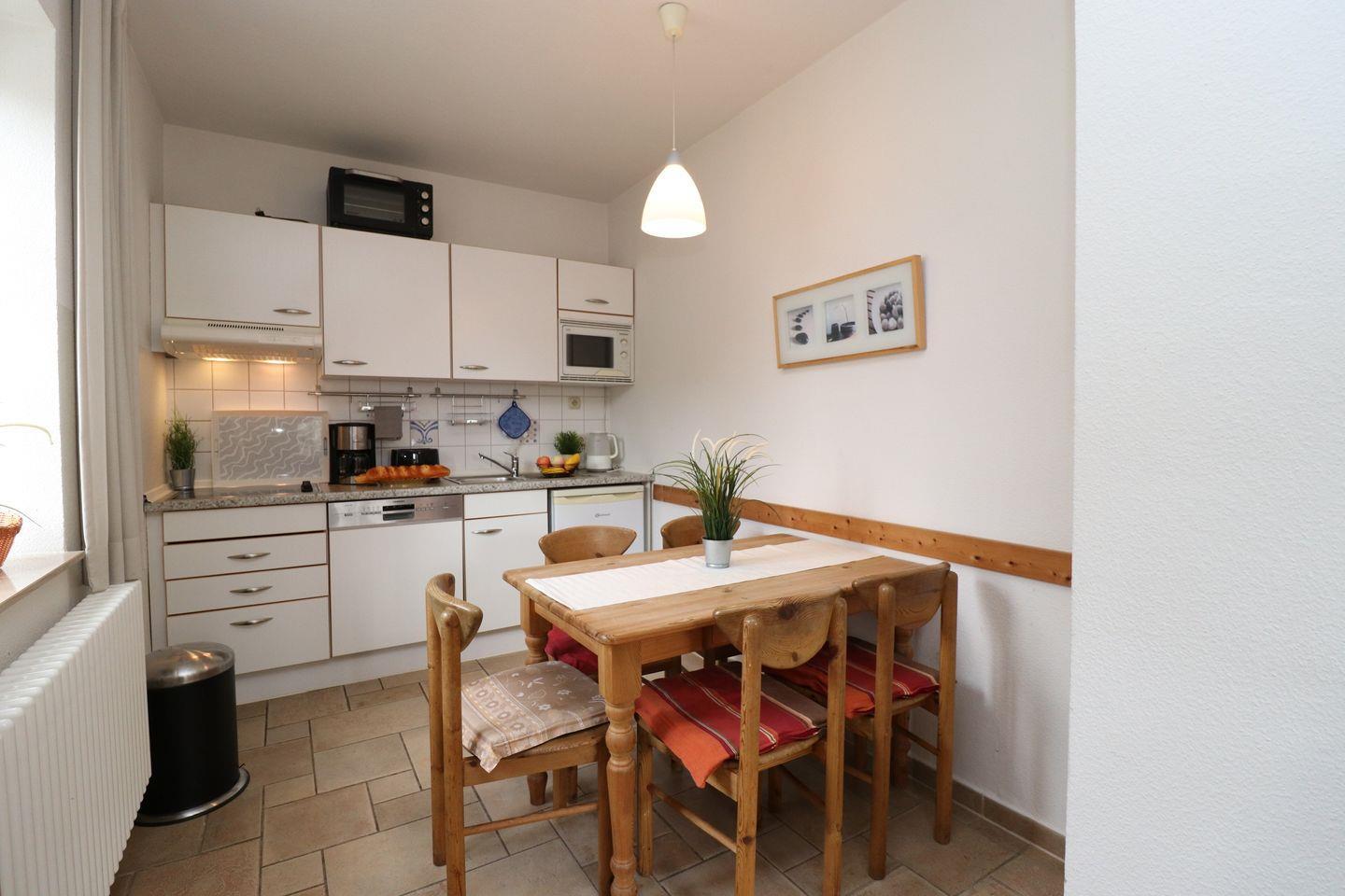 In der „Großen Wohnung“ erwartet Sie ein gemütliches Ambiente, das zum Entspannen einlädt. Die Unterkunft verteilt sich über zwei Etagen und bietet eine ansprechende Raumgestaltung. Im Erdgeschoss finden Sie die offene Küche, die mit modernen Annehmlichkeiten wie einem Herd, Backofen, Kühlschrank, Geschirrspüler und allerhand Küchenutensilien ausgestattet ist. Hier können Sie köstliche Mahlzeiten zubereiten und in geselliger Runde im Essbereich genießen. Im angrenzenden Wohnzimmer mit komfortabler Sofaecke können Sie nach einem erlebnisreichen Tag am Strand entspannen und den Abend bei einem Film auf dem digitalen Sat-TV ausklingen lassen.