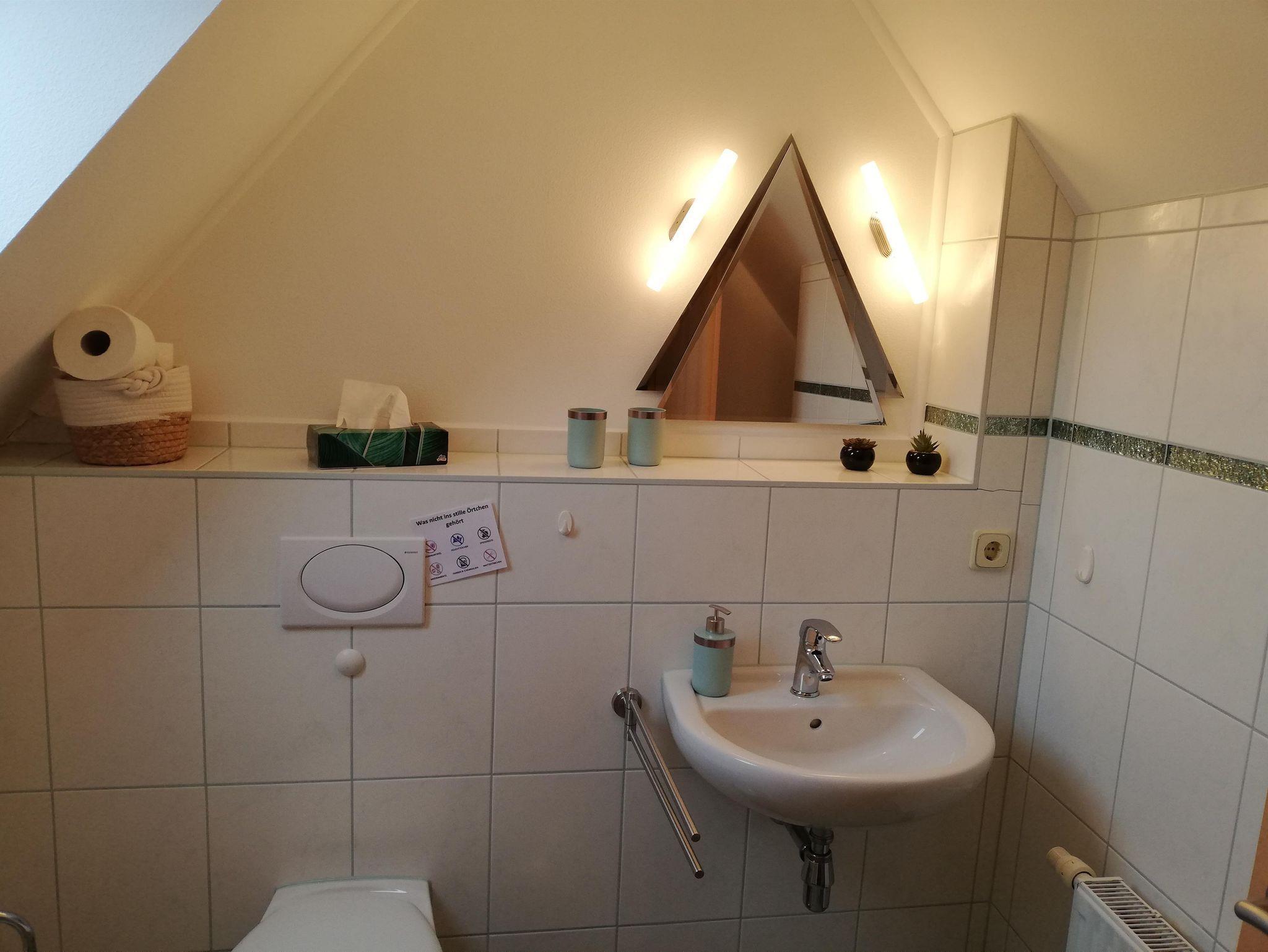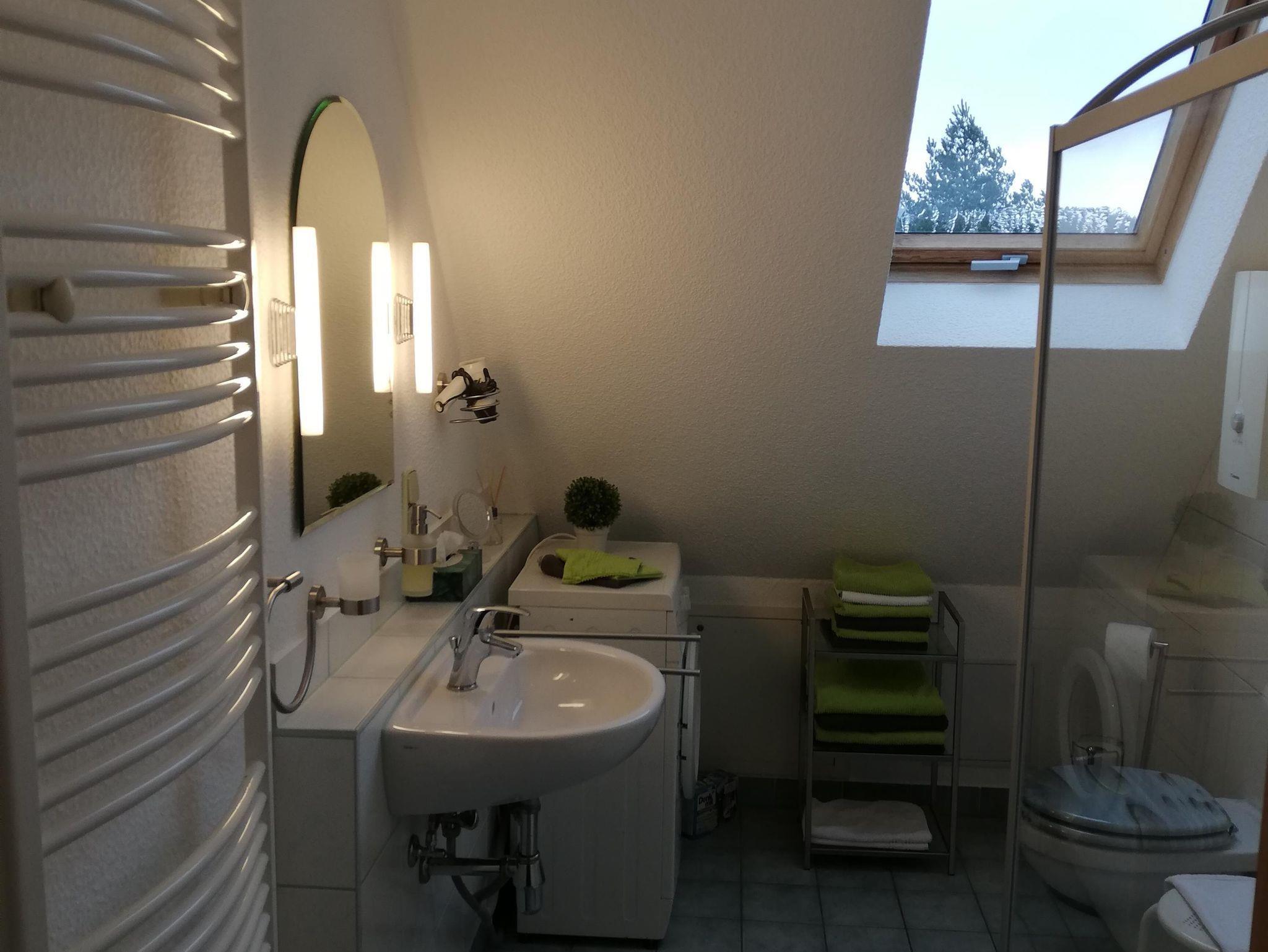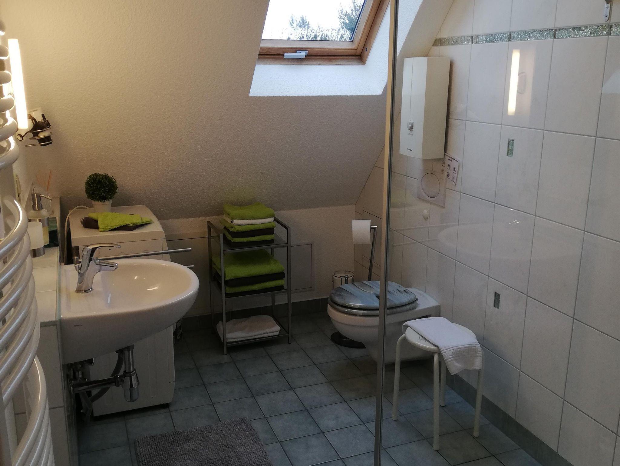 Das Badezimmer mit bodentiefer offener Dusche wird durch einen Föhn sowie der Waschmaschine mit den nützlichen Dingen des Alltags komplettiert.