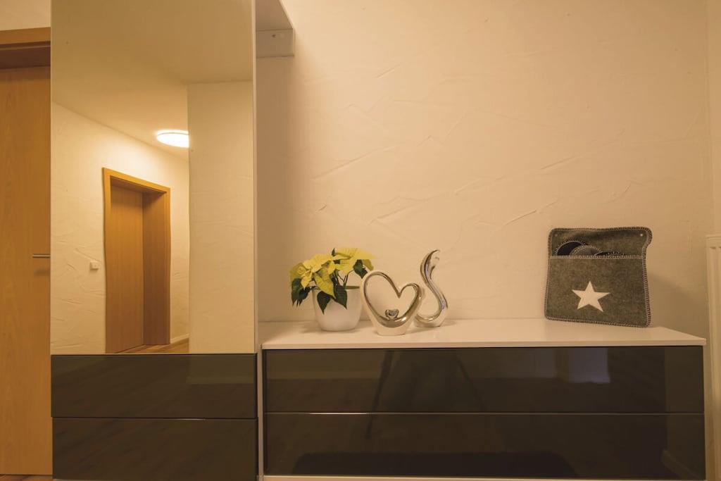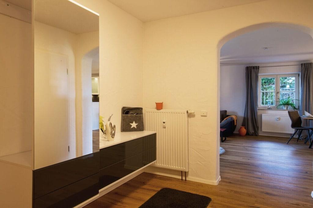 Die Ferienwohnung wurde 2019 vollständig renoviert, elegant neu eingerichtet und bietet alle Annehmlichkeiten. Eine großzügige Terrasse (überdacht) erlaubt, auch bei Regen, die angenehme Luft und traumhafte Sonnenuntergänge zu genießen. In der kompletten Ferienwohnung wurde Eichenparkett verlegt. Im Schlafzimmer finden sie ein Doppelbett mit Nachttischchen und Leseleuchten sowie einen großen Kleiderschrank ausreichend für 2 Personen vor. Das Kinderzimmer bietet 2 Einzelbetten, ebenfalls Nachttischchen, Leseleuchten und einen großen Kleiderschrank. Der Wohn- und Essbereich bietet auf der ausziehbaren Couch bei Bedarf weitere Schlafplätze (140x200) für zwei Personen. Im Wohnbereich steht Ihnen ein Fernseher mit SAT Empfang und viele Spiele und Bücher zur Verfügung. Der Essbereich ist für 6 Personen ausgerichtet. Die Küche ist voll ausgestattet. Neben einem großen Kühlschrank mit Gefrierfach, ein Ceran Kochfeld sowie ein Backofen ist selbstverständlich eine Spülmaschine integriert. Ein Toaster, Wasserkocher und ein Kaffeevollautomat sind vorhanden; Kochtöpfe und weitere Küchenhelfer runden das Angebot sinnvoll ab. Das Badezimmer bietet eine großzügige Dusche mit einer Dusch-Trennwand, einer Badewanne, Toilette, zwei Waschtische sowie zwei Spiegelschränke. Zusätzlich sind hier noch die Waschmaschine und der Trockner untergebracht. In der Diele/Flur bietet Ihnen eine Garderobe viel Stauraum für Kleidung und Persönliches.