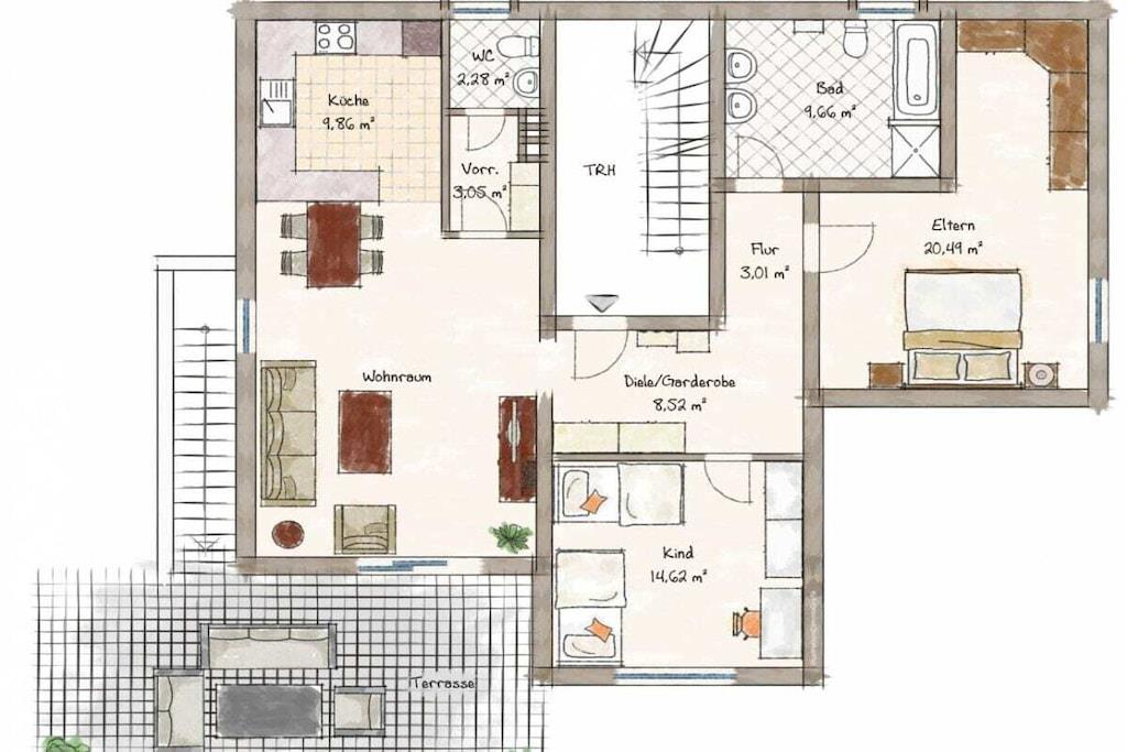 Souterrain: (Eingangshalle(, ), Küche(Herd, Kochplatte, Kochherd, Backofen, Spülmaschine, Kühlschrank, Heizung), Wohn/Esszimmer(, TV, Esstisch), Schlafzimmer(, , Doppelbett, Radio), Schlafzimmer(, , Einzelbett, Einzelbett, Babybett), Badezimmer(, Toilette, Badewanne, Dusche, Waschbecken, Heizung)) , , , Eingangshalle, guest toilet(, Toilette, Waschbecken), Internet, Trockner, Waschmaschine, Heizung, Terrasse(Gartenmöbel, Markise), Parkplatz, Fahrräder verfügbar, Bügelbrett, Bügeleisen, Trockenschrank