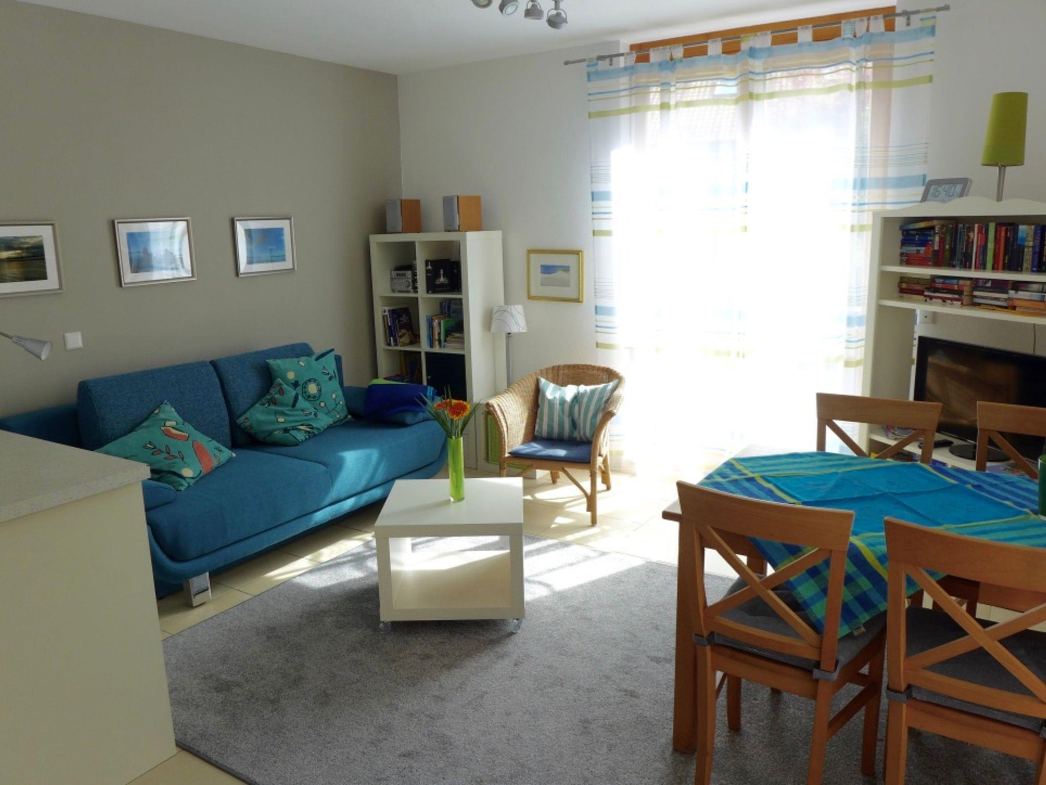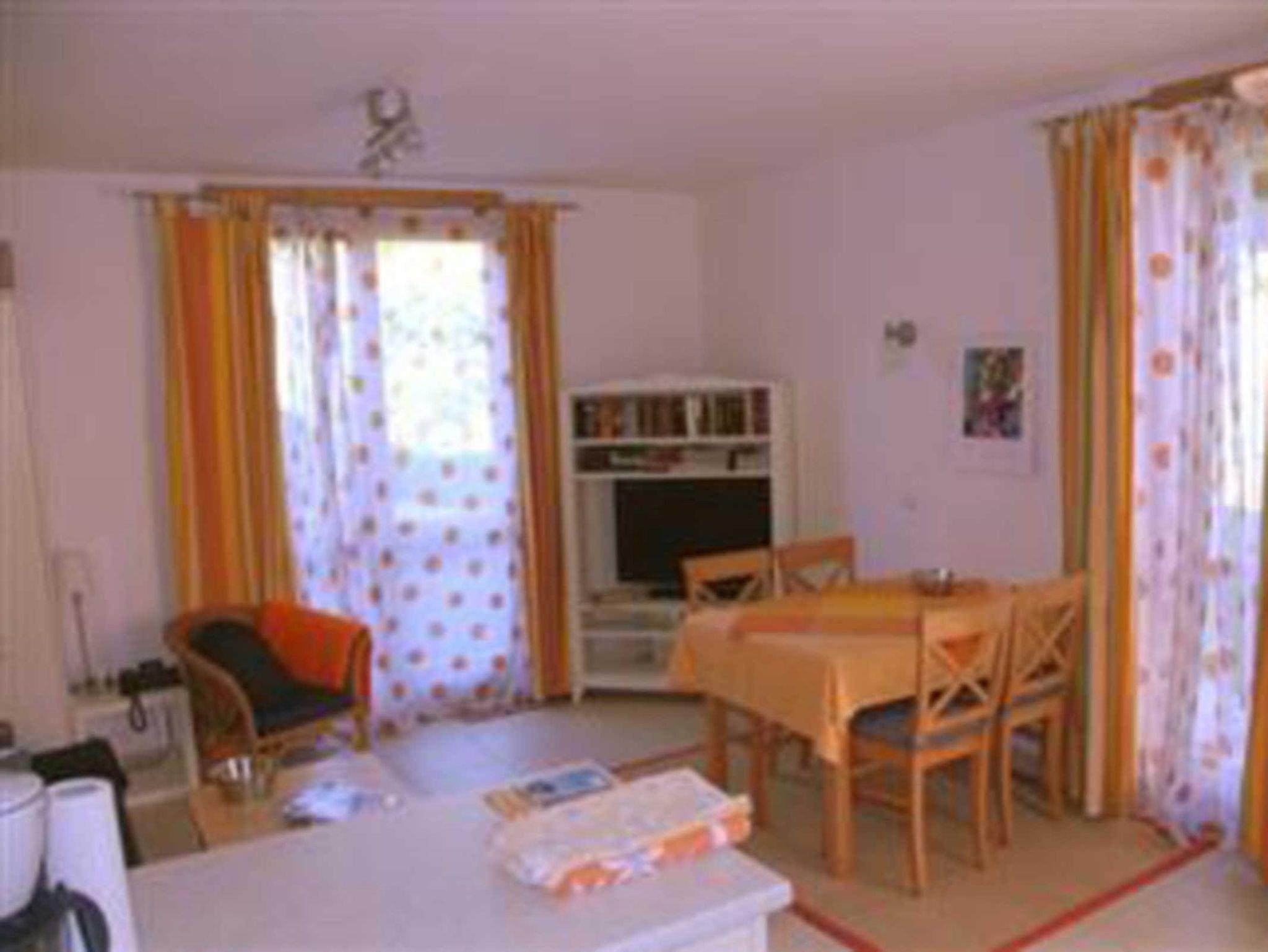 Im Wohn/Eßbereich befindet sich eine ausziehbare Couch (Schlafgelegenheit für zwei Personen) Liegefläche 1,50 m x 2 m. Radio, CD Player und ein Flachbildfernseher sowie ein Esstisch für 5 Personen mit einem Tripptrapp Kinderstuhl.