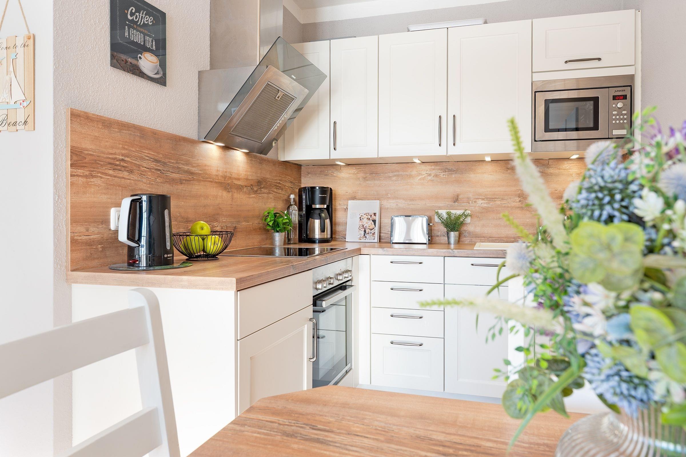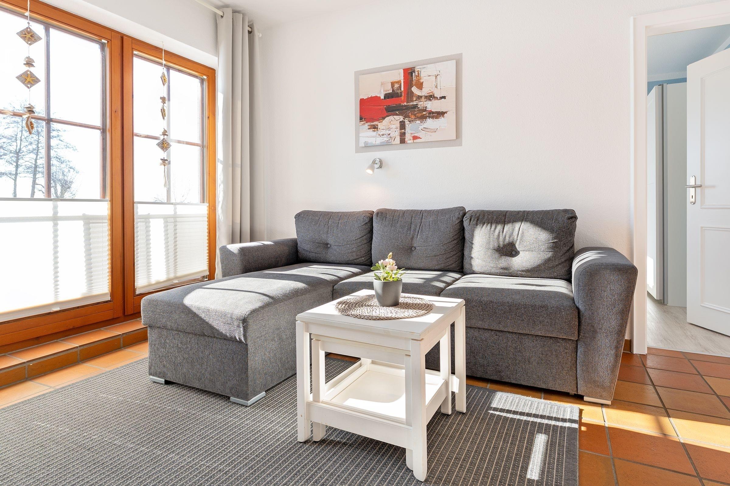 Herzlich willkommen im Urlaub! Vom lichtdurchfluteten, liebevoll eingerichteten Wohnbereich mit TV-Ecke führt ein direkter Zugang zum Balkon. Dieser ist zur Sonnenseite ausgerichtet mit Blick auf den malerischen Großen Pönitzer See. Die in den Wohnbereich integrierte, offene Küche ist mit einem gemütlichen Essplatz ausgestattet. Das Schlafzimmer ist mit einem bequemen Doppelbett (180x200 cm) und einem geräumigen Kleiderschrank möbliert, im Wohnzimmer lässt sich die Couch in ein Doppelbett (160x180 cm) umfunktionieren. Das Duschbad ist hell gefliest.