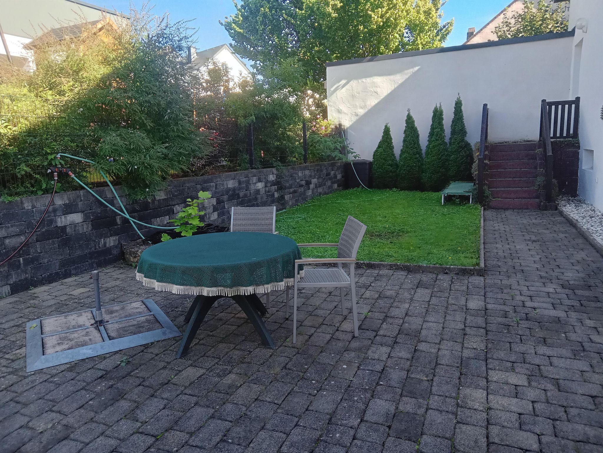 Ferienwohnung 1: 1. Stock, 45 qm, Schlafzimmer (getrennte Betten möglich), (Glasbausteine anstatt Fenster im Schlafzimmer), Bad mit Dusche/WC, Wohn-, Kochbereich mit Sofa. Ebenerdige Gemeinschaftsterrasse zur Mitnutzung.