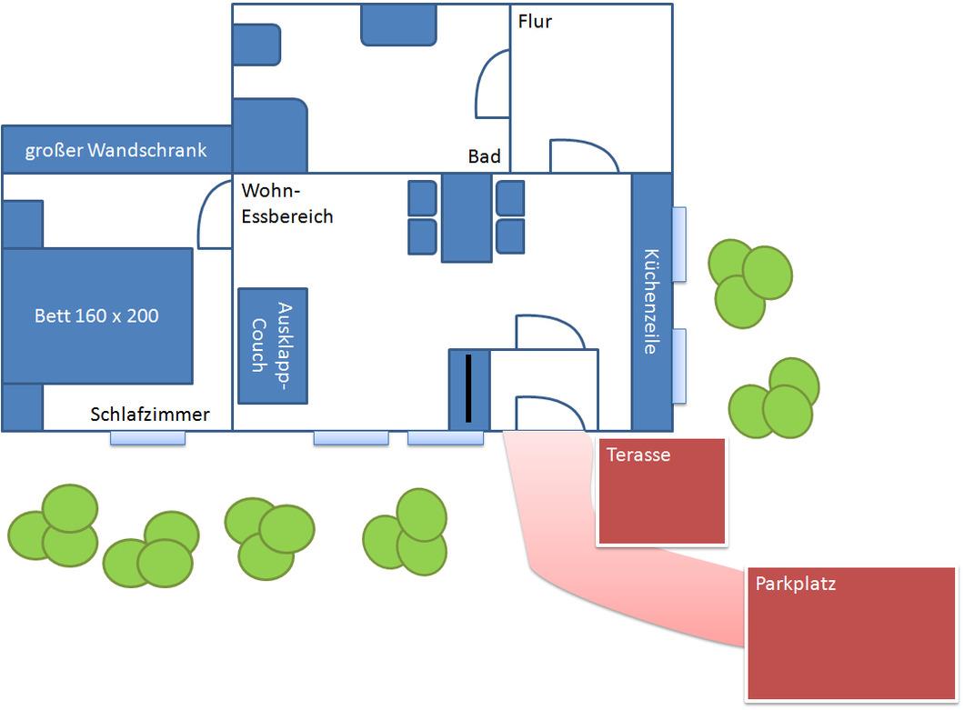 Die Ferienwohnung ist ca. 50 qm groß und für 2 Personen und 1 Kind geeignet. Sie betreten die Wohnung über einen eigenen Eingang, einem netten Vorflur. Anschließend kommen Sie in einen Wohn/Essbereich mit komplett eingerichteter Küche: Einbauherd mit Cerankochfeld, Backofen, Kühlschrank mit Gefrierfach, Geschirrspüler, Kaffeemaschine, Senseo-Kaffeeautomat, Wasserkocher, Toaster , Mikrowelle und weiteren Küchenutensilien. Im Wohnzimmer befindet sich eine gemütliche Sitzecke mit Schlafsofa. Außerdem verfügt das Wohnzimmer über ein Flachbild Smart TV Gerät sowie Radio .Ein großer Esstisch lädt zum gemeinsamen Essen oder Spielen ein .Vom Wohnzimmer gelangt man ins Schlafzimmer, dass mit einem Doppelbett, Kleiderschrank und Tischleuchten ausgestattet ist .Auf Wunsch kann ein Kinderreisebett gestellt werden. Das Bad ist sehr geräumig und mit einer Dusche ausgestattet. Ein PKW Parkplatz befindet sich direkt vor der Tür. Eine Außenterrasse bietet sich zum Sitzen und Erholen an. Entsprechende Möbel sind vorhanden. Bettwäsche und Handtücher werden gestellt.