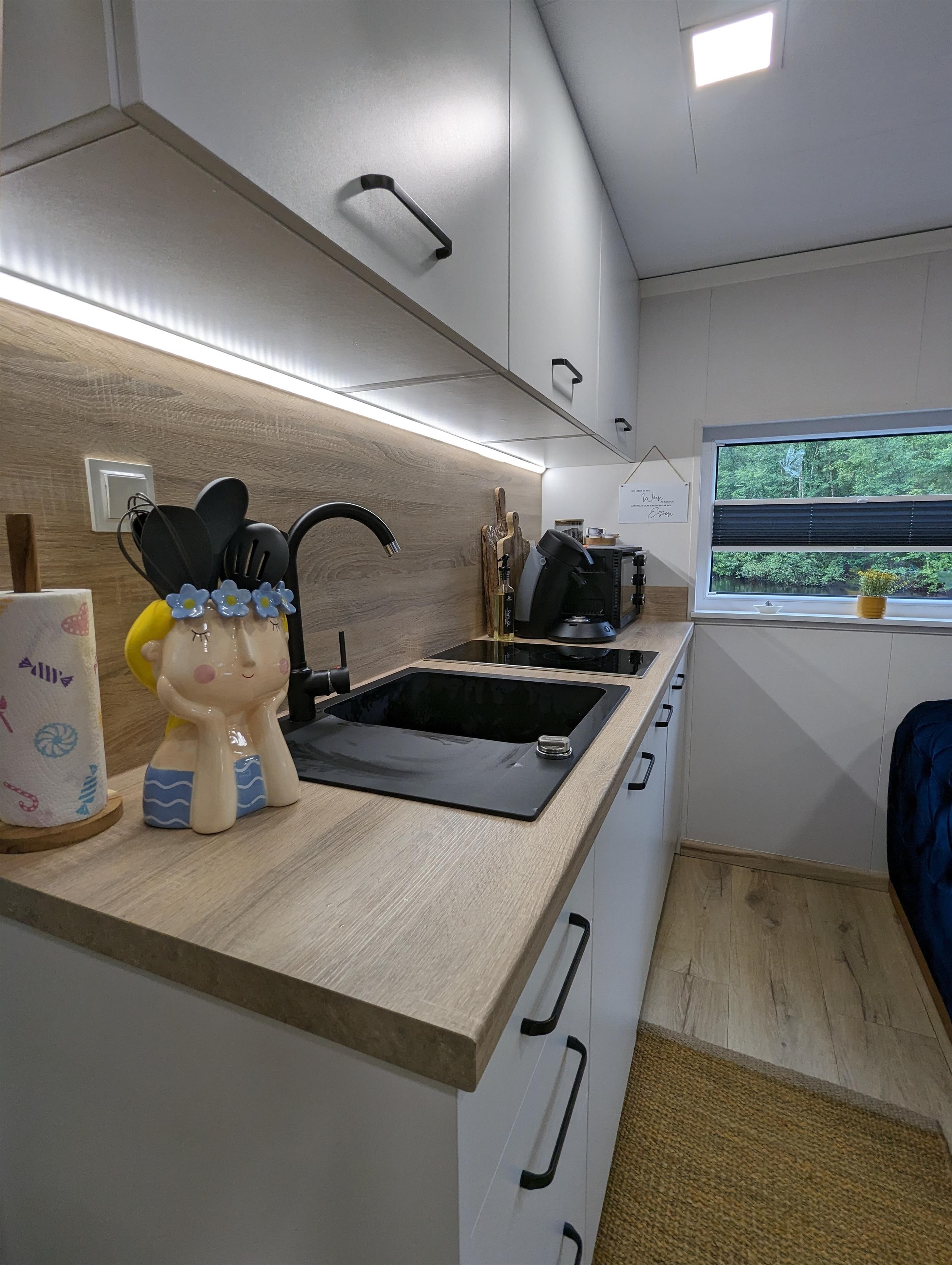 Über dem Wohnbereich geht es mit einer Leiter hoch zum Schlafloft. Dort finden weitere 2 Personen ein gemütliches Plätzchen (160cm Matratze). Alle Tinyhouses sind mit einer Klimaanlage und Infrarotheizung ausgestattet.