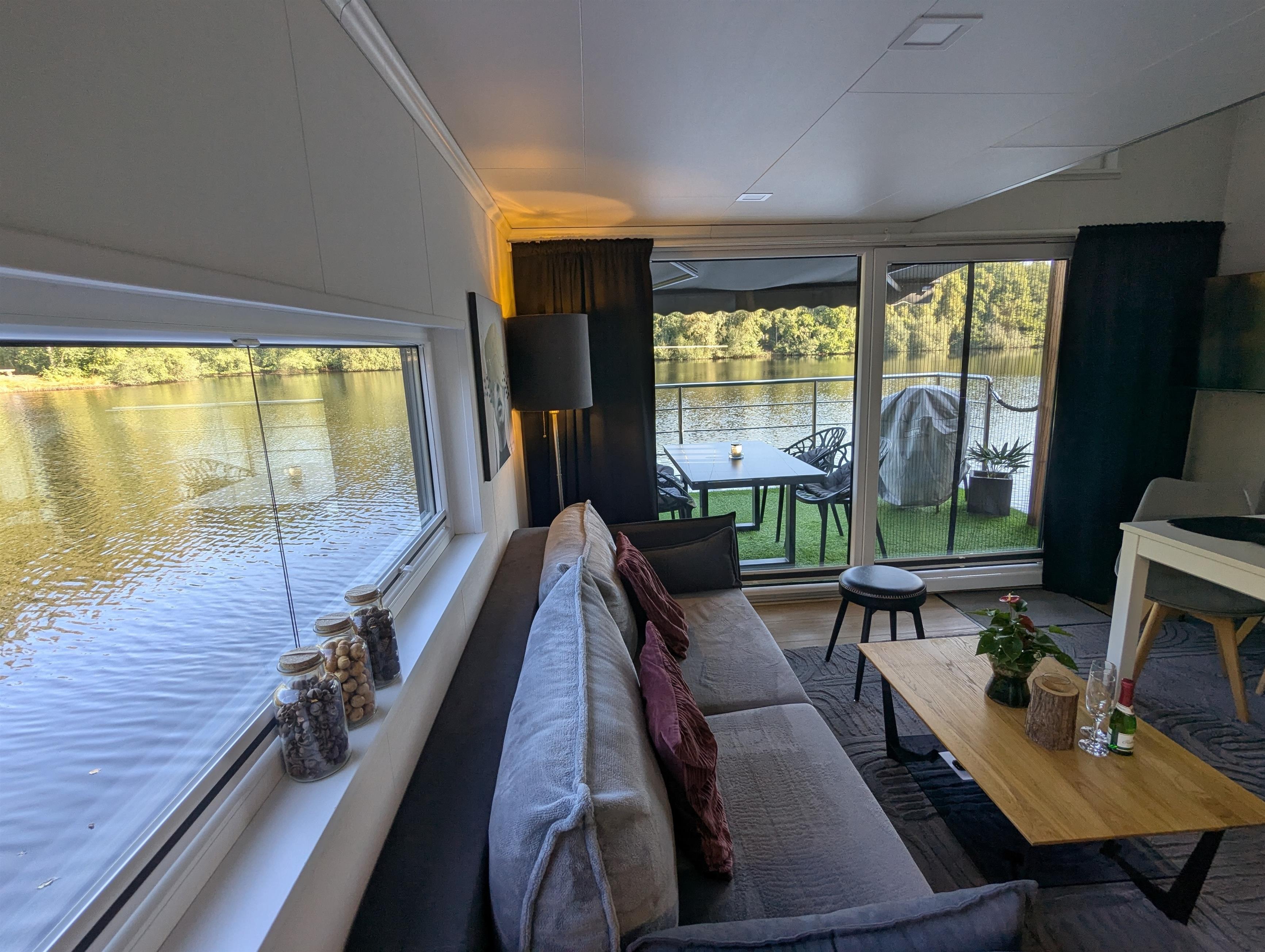 Der kompakte Wohnbereich bietet Ihnen zur gemütlichen Couch und dem einmaligen Blick auf den See,