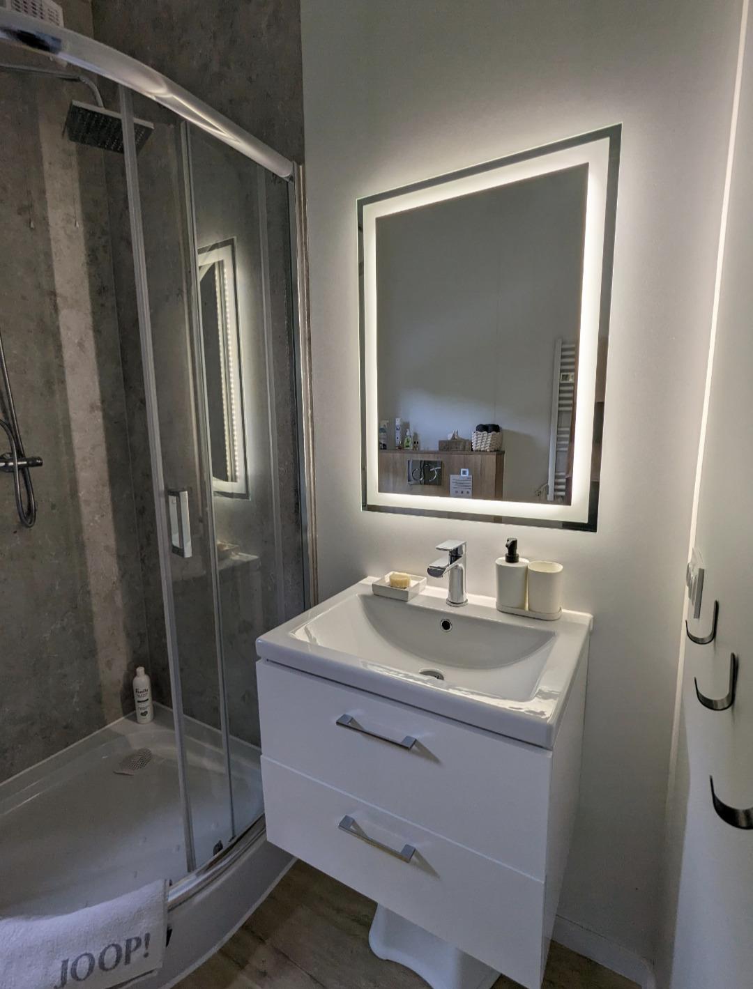 Das Tinyhouse hat ein seperates Schlafzimmer (Doppelbett 160cm) mit dem Blick zum privaten Strand. Ein WC mit Dusche ist ebenfalls vorhanden und mit Shampoo und Handtüchern ausgestattet.