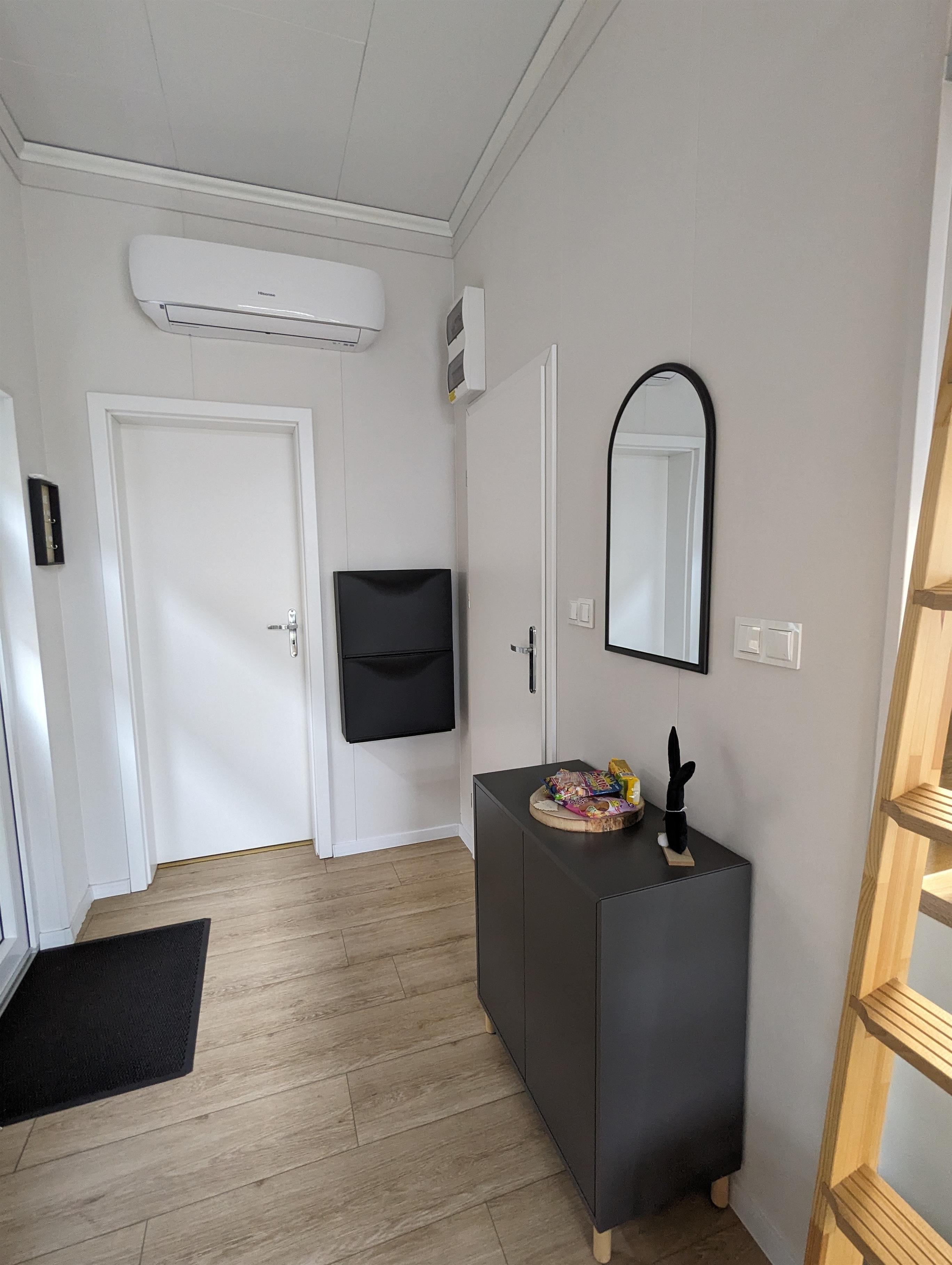 Über dem Wohnbereich geht es mit einer Leiter hoch zum Schlafloft. Dort finden weitere 2 Personen ein gemütliches Plätzchen (160cm Matratze). Alle Tinyhouses sind mit einer Klimaanlage und Infrarotheizung ausgestattet.